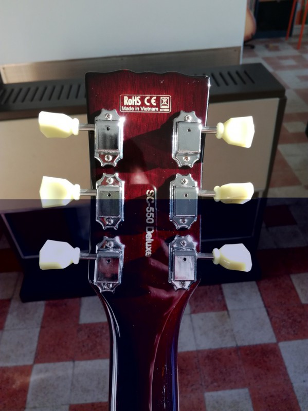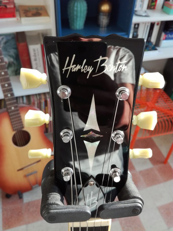 Les finitions sont globalement très bonnes, les frettes sont très bien posées, aucune n'accroche les doigts, la guitare est arrivée bien réglée. Le sillet est très bien posé mais je ne suis pas convaincu qu'il soit en os. La plaque qui cache le trussrod porte l'inscription "HB" et pas "Deluxe".