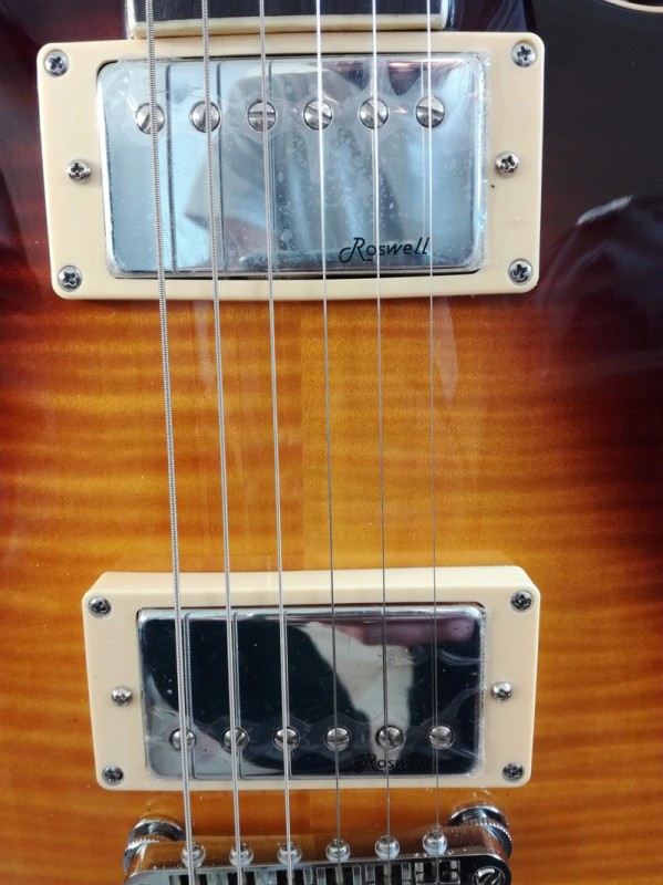 Je l'ai, premières impressions à chaud : elle est vraiment légère, à se demander si le corps n'a pas de chambres acoustiques. Le manche est plutôt rondouillard, en tout cas un peu plus que celui de ma V100. Les micros sont bien des Roswell, avec un niveau de sortie assez balèze. Le sustain est conséquent. Le corps est en trois parties sur la mienne. Les potards sont fermes et très progressifs, le sélecteur ne claque pas et le changement de micros se fait tout en souplesse.