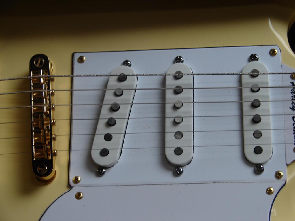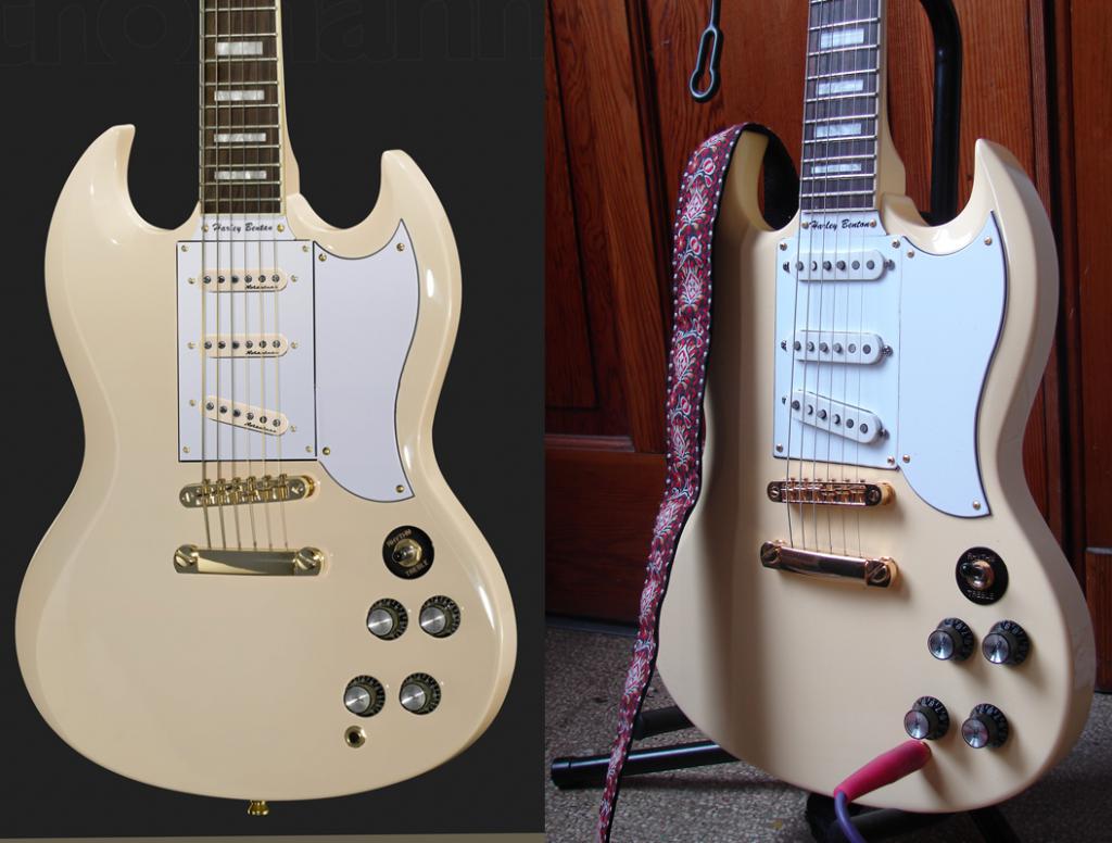 les sons sont mieux qu'en micros doubles spilttés et moins bien qu'une strat (ça c'était à prévoir, bois, chevalet et diapason différents). pour ceux qui voudraient savoir si c'était mieux avec les doubles d'origine et bien oui, c'était mieux, mais je vous rappelle que je suis servi point de vue sons SG avec mes 2 gibson SG (Std et R61).