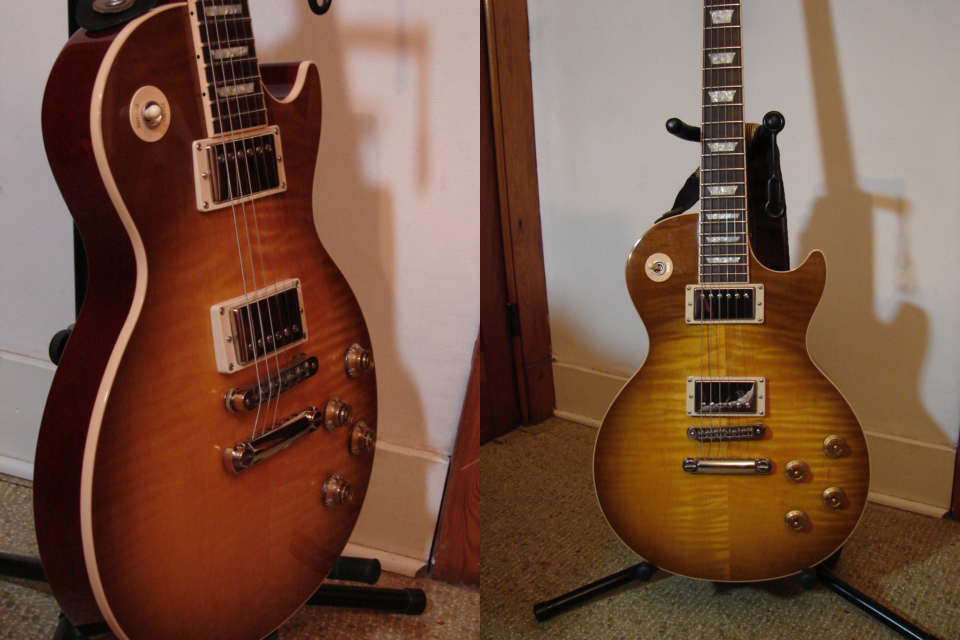 Dommage sur le modèle photographié que les deux parties de la table soient autant visibles car dissemblables, la partie basse, vers les potis semblant même quasiment pas flammée (toutefois un peu moins évident sur les dernières photos de face, avec la Gibby LP Standard que sur la première photo où c'est plus flagrant) ... C'est davantage un risque avec un Cherryburst qu'avec le Honeyburst clair que semblent avoir les dernières 450+ livrées.