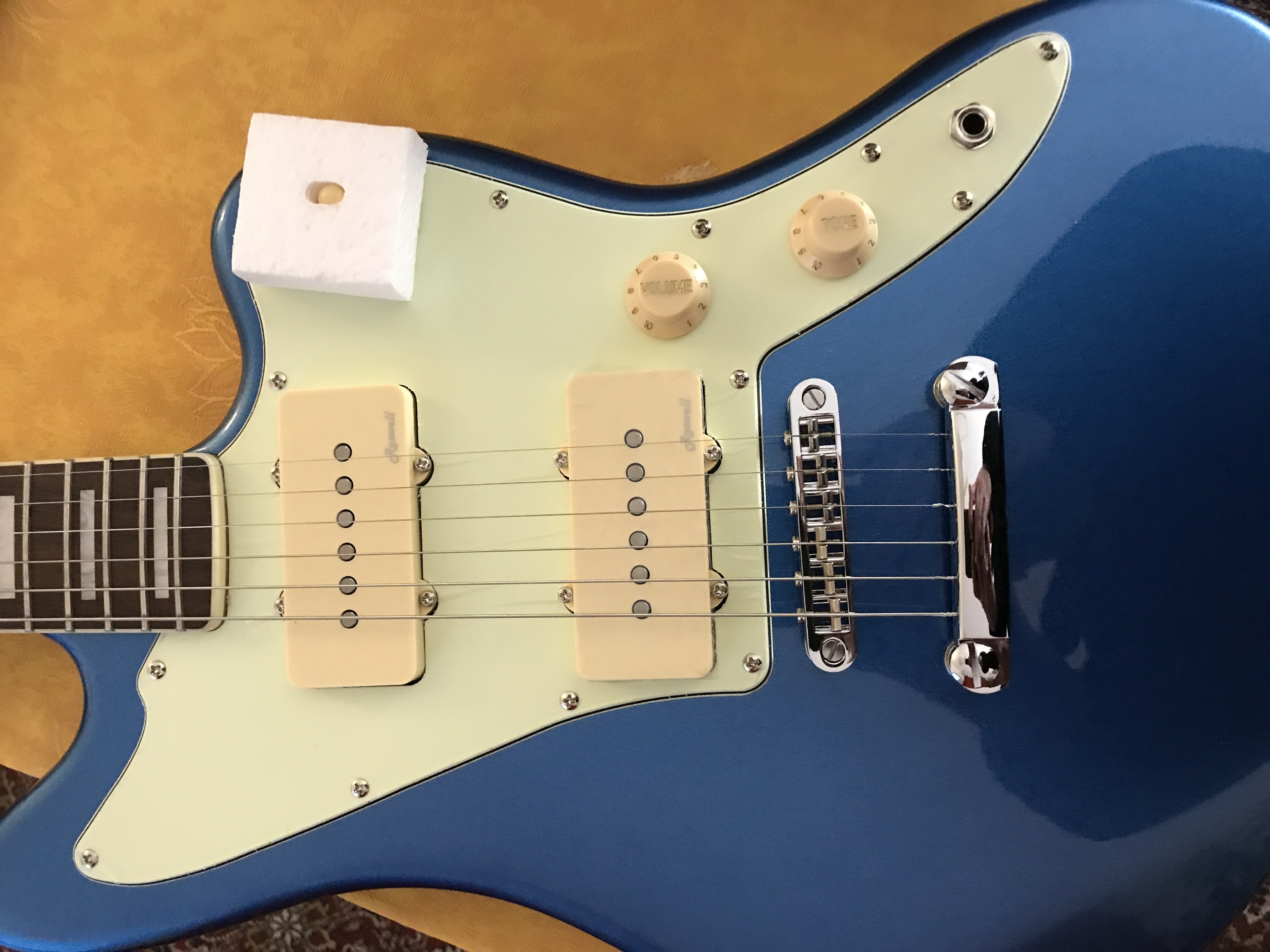 Finition irréprochable (attention: il y'a DEUX couches de plastique sur le pickguard) et ça ça fait plaisir. Manche et chevalet bien alignés en particulier. Pas de défaut de finition repéré pour l'instant (je l'ai juste déballée, inspectée et jouée dix minutes mais il n'y a rien qui m'ait frappé).