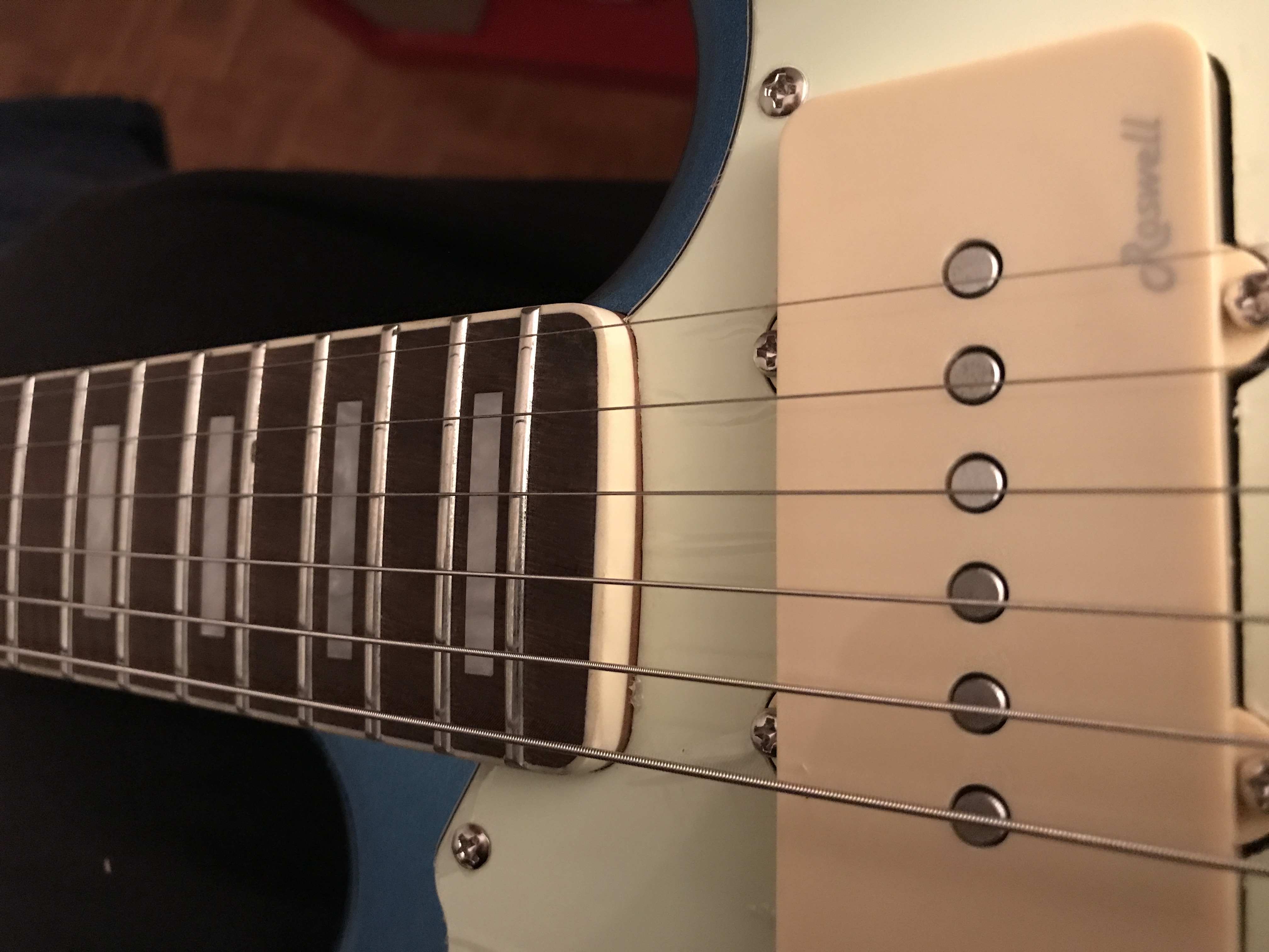 Le frettage est très correct même si un petit polissage supplémentaire des frettes ne fera pas de mal, et les bords de touche sont nickel. Alors oui le radius est plat (12) mais ça me dérange moins que je le pensais. Surtout, elle est arrivée impeccablement réglée, c'est rare! Malheureusement avec du 9-42, c'est nettement trop léger pour une tele.