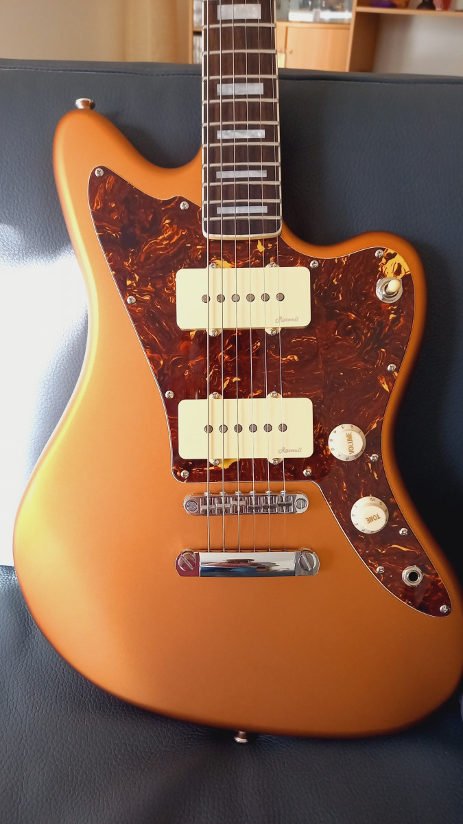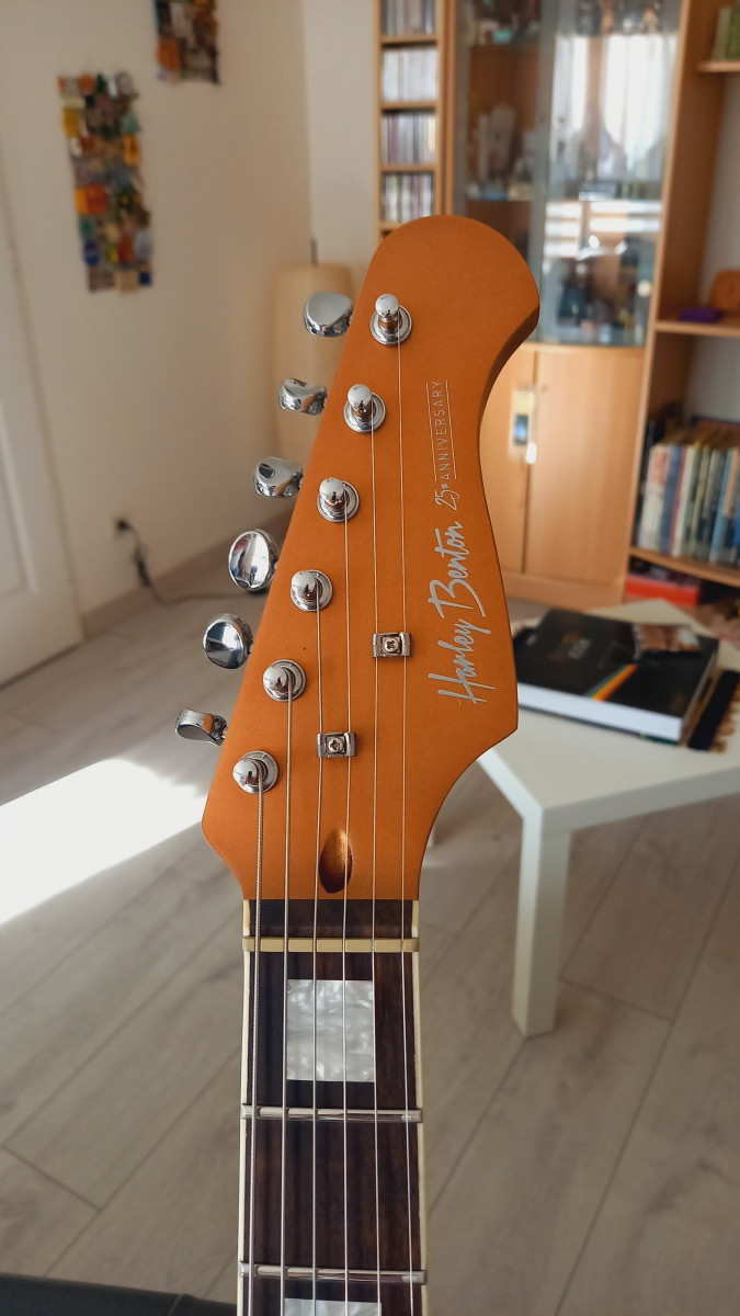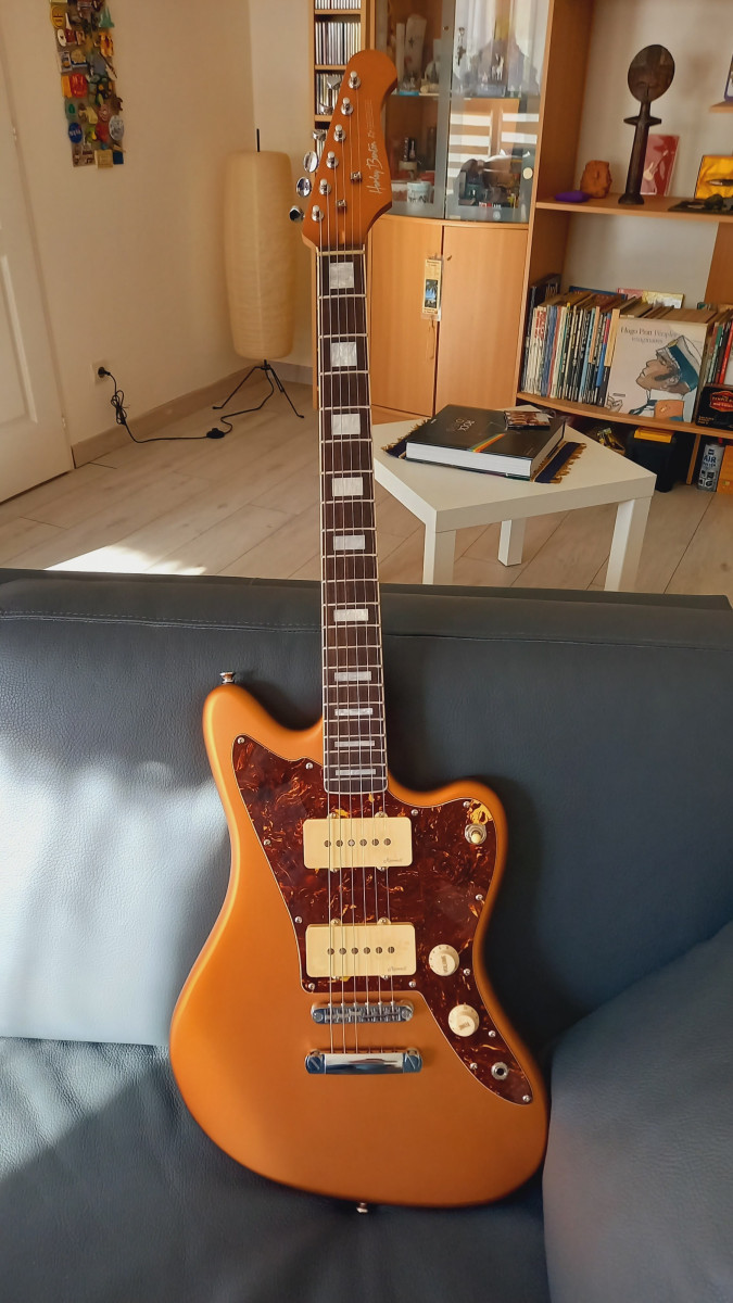 Après le déballage (package toujours impeccable en provenance de chez Tho...) la première impression est vraiment très bonne. D'abord la guitare en 'jette', elle a vraiment de la gueule. Pour la couleur, on est beaucoup plus sur du 'bronze' que sur du 'Gold'... La teinte est vraiment jolie (en tous cas, moi elle me plait). La finition "satinée" du corps est très agréable au toucher, très doux. une première inspection ne fait apparaitre aucun défaut. Les frettes sont parfaitement polies et n'agressent pas du tout la main quand on la fait glisser le long du manche. La touche, bien foncée (même 'noire', comparée à un autre modèle de la marque que je possède), est très belle, sans défaut. Le bois du manche est sombre et on voit assez bien le 'flamed' du plus bel effet. La tête, "matching", a donc la même finition que le corps. Vraiment ça le fait ! Je suis surpris par les mécaniques.....à blocage...