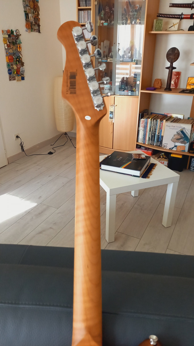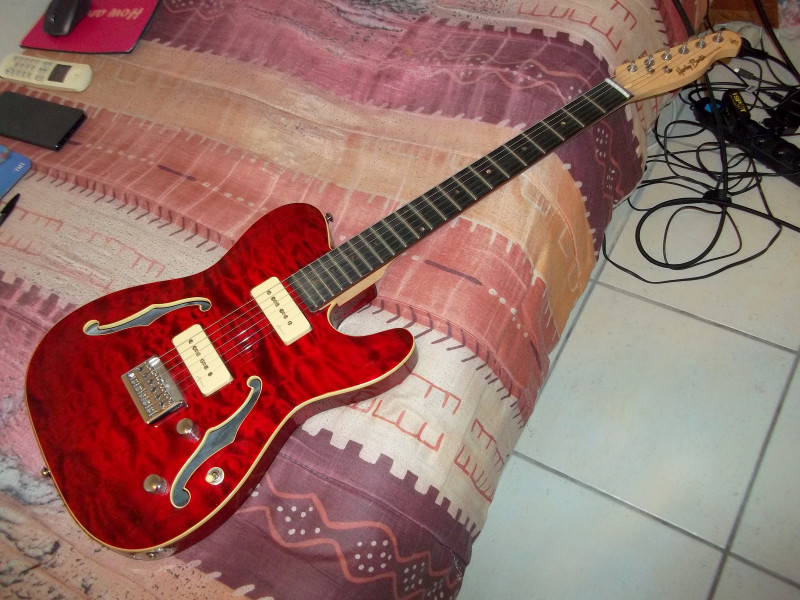 Je n'ai eu qu'à serrer les vis des mécaniques, accorder, et le tour était joué. L'intonation et l'action sont parfaites ! Le profil du manche ('D') est très confortable (en fait, j'ai la même sensation qu'avec un 'C'). Le poids de la guitare est agréable, ni lourd ni léger. Jouée à vide, la guitare sonne bien et le jeu est très agréable. Amplifiée, je n'ai fait qu'un test à bas volume sur mon Supro Blues King. Ca sonne bien, pas 'agressif', sur les trois positions (qui sont équilibrées) de micros... Les potars sont effcicaces, et le tone m'a l'air particulièrement bien pour éclaircir ou assombrir le son...