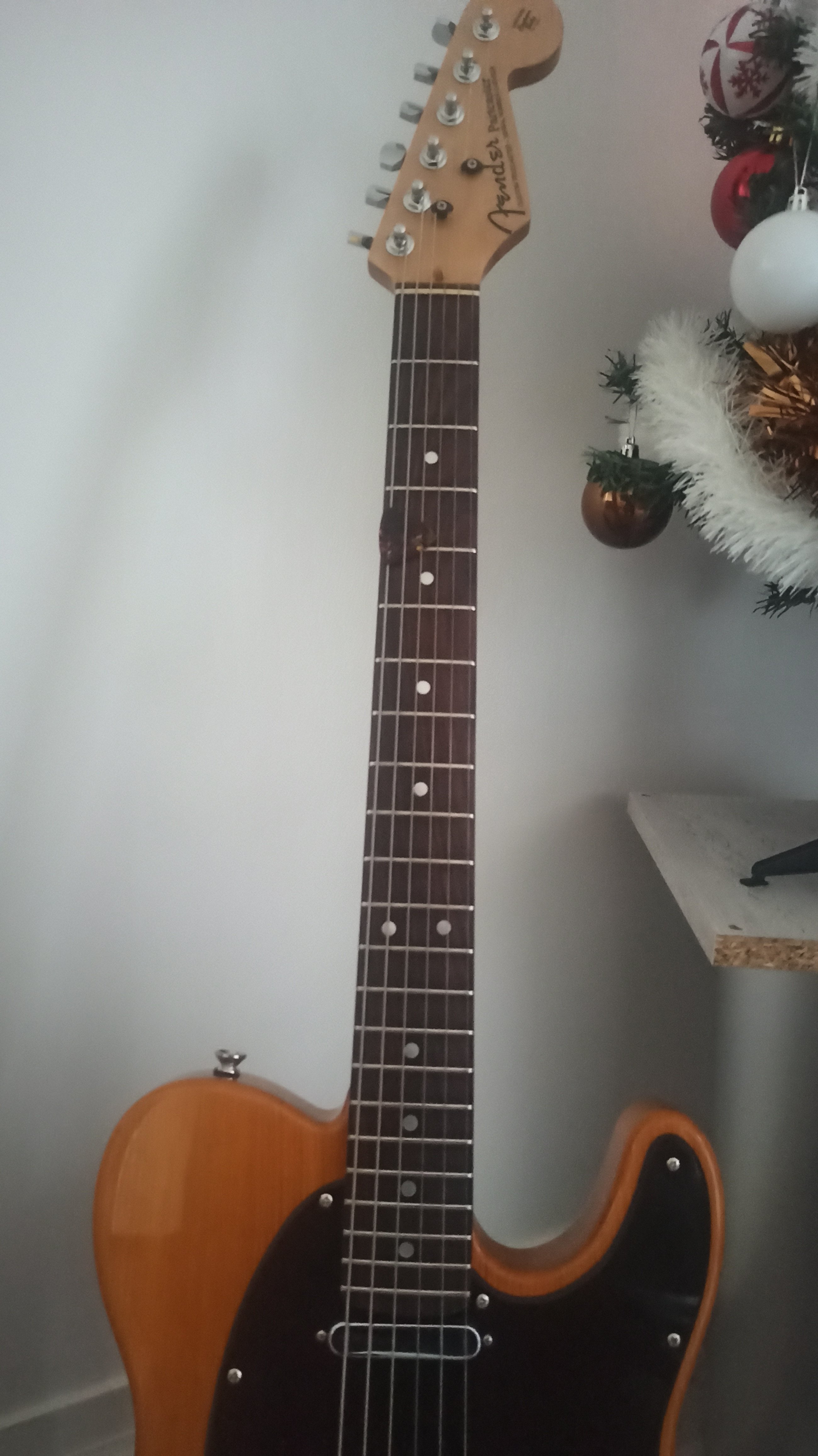 J'ai restauré ce manche qui est vraiment superbe, et collé un logo Fender Partcaster sur là tète.