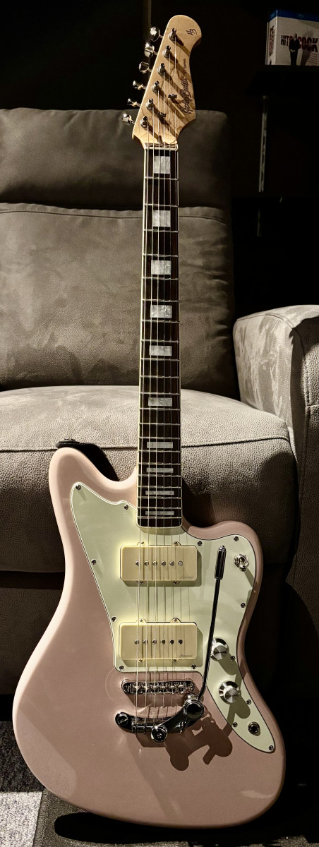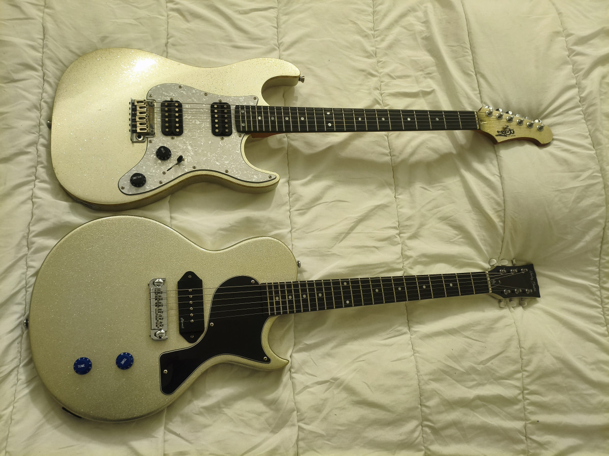 Je rejoins le club, avec ma première gratte à P90. J'ai toujours aimé la tronche des Gibson les paul junior double cut, et je n'avais jamais essayé de P90 (en 35 ans de gratte...). j'ai eu envie d'essayer, sans trop investir et j'ai commencé à chercher une Harley Benton DC junior autour de chez moi...sans succès. Mais j'ai vu passer une SC junior (forme que je trouve horrible, par contre), en version argentée à paillettes... une horreur mais elle n'était pas chère du tout. Je me suis dit que ça le ferait pour enfin essayer un P90.
