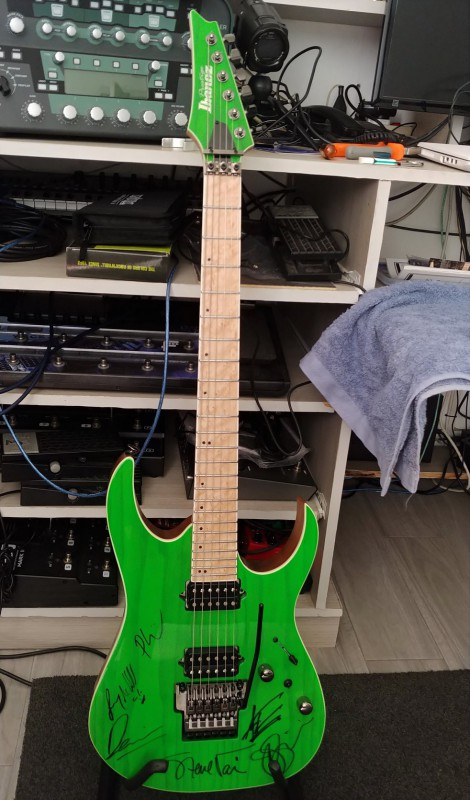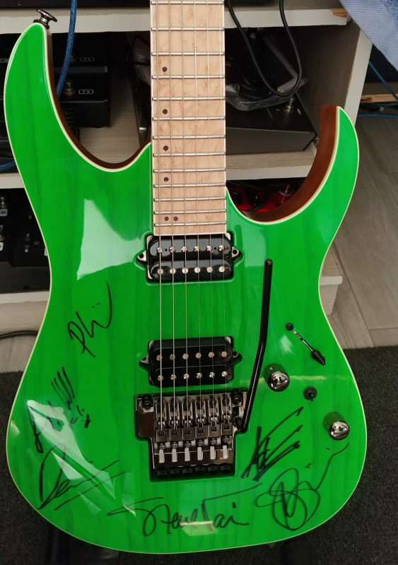 Upgradé de dingue : Micros BareKnuckle aftermath chevalet et juggernaut manche, sélecteur 5 positions, tone en push pull désactivable à la place du killswitch, ajout d'un trebble bleeed, chevalet hipshot, sillet en graphite et surtout la magnifique signature de Guthrie Govan