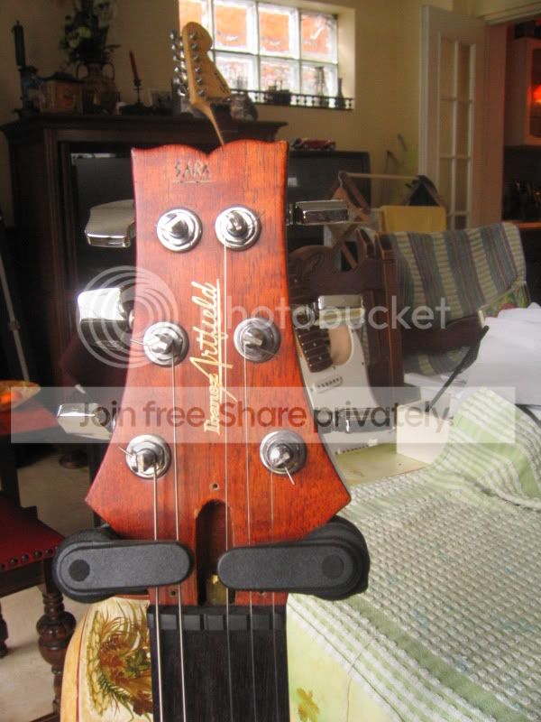 Voici donc en premier lieu la tête de l'instrument, j'ai essayé en vain de faire ressortir les figure du placage de tête, la tête est orné d'un magnifique placage en Bubinga ondé!! Et du logo ibanez Artfield en doré, vous pourrez voir aussi que l'ancien proprio qui devait être une espèce de cinglé a effectuer un petit marquage sur la belle en essayant de lui donner un nom... Steve Vai aura fait des émules et pas qu'en bien...