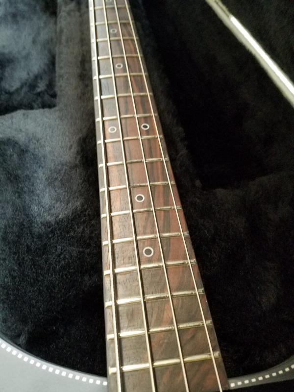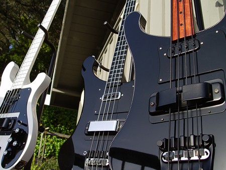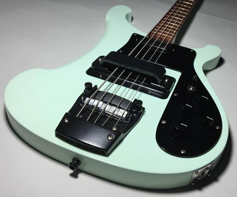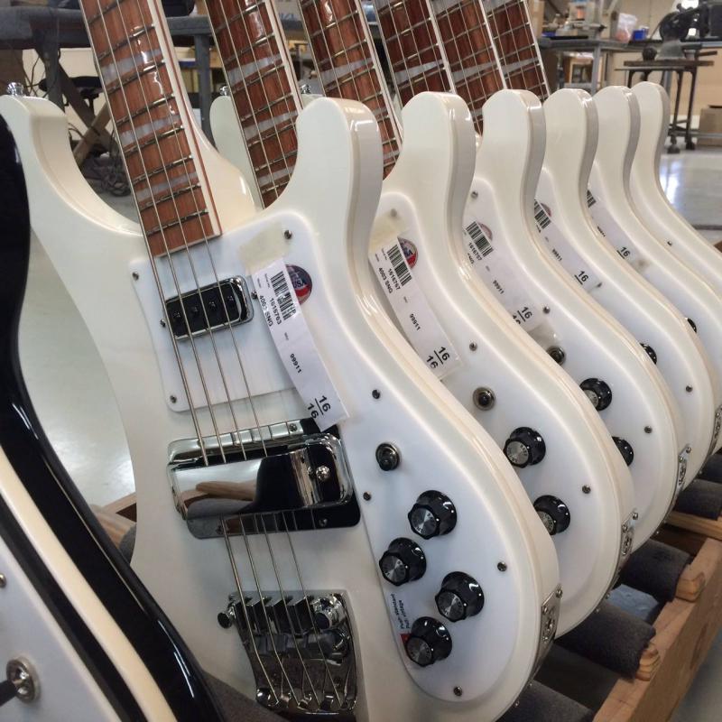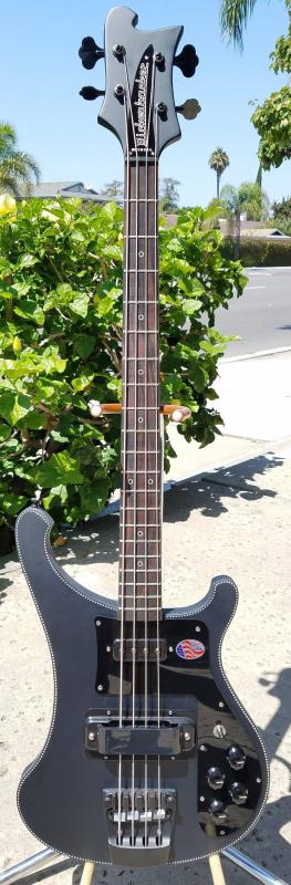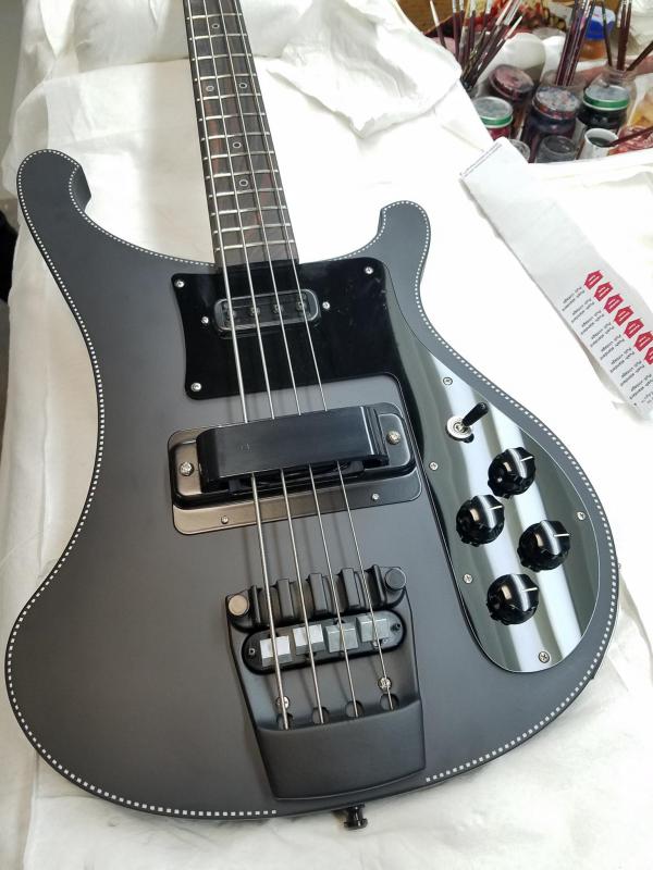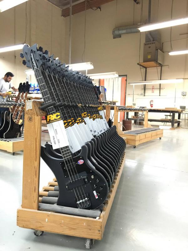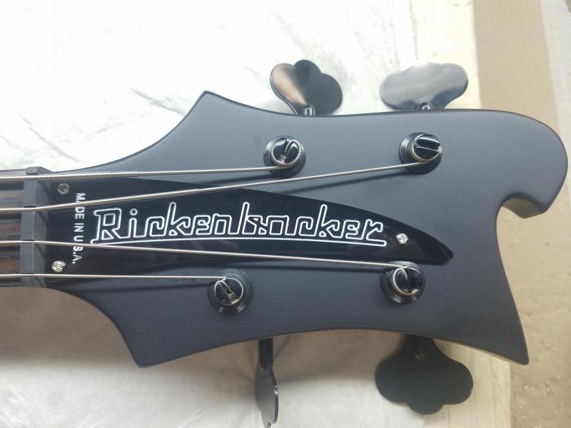 4003 "Noir" : finition mate, repères de touche spéciaux, filets checkerboard, accastillage noir mat, TRC noir, boutons vintage, touche en palissandre particulièrement foncé (souvent sur les Rickenbacker contemporaines, la touche tire un peu sur le rouge/rosé), sur celles rangées sur le râtelier on dirait même de l'ébène.