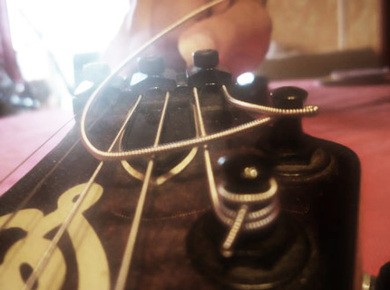 . Un p'tit truc: utiliser un capo pour maintenir la corde en place pendant qu'on s'affaire sur les mécaniques. Et commencer par les mi, puis le la et le fa et enfin le ré et le sol.