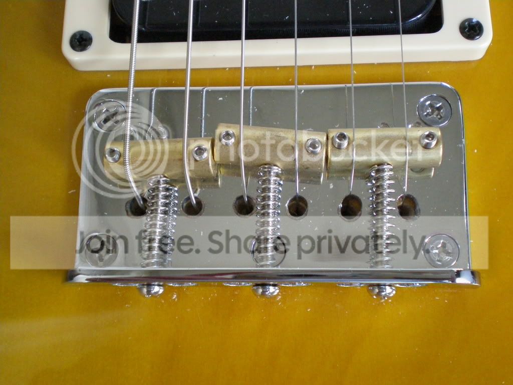 Oui je confirme, ton pont est fixé par trois vis, les ponts "vintage" sont fixés par quatre vis. Et les trous pour le passage des cordes à travers le corps ne sont pas à la même place.