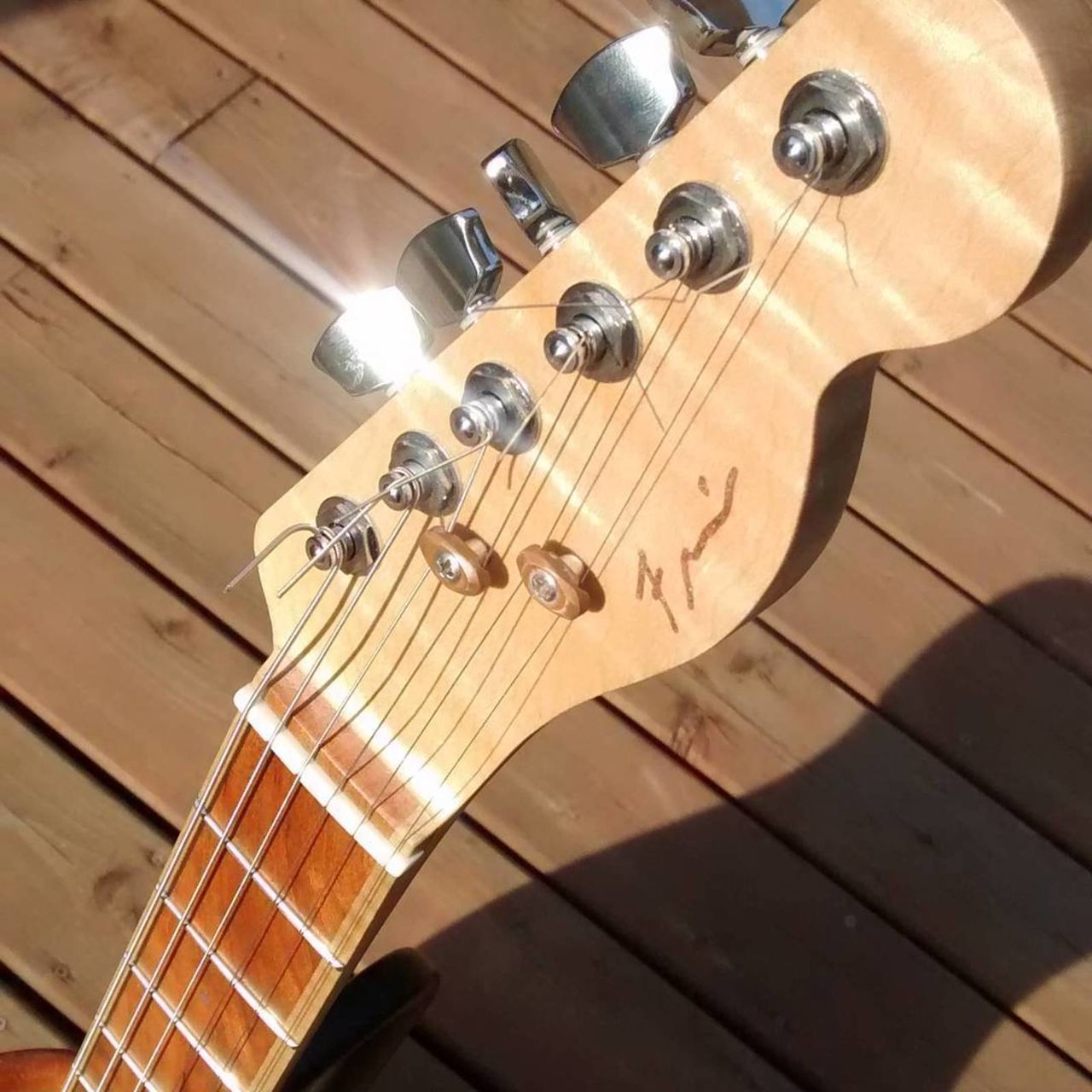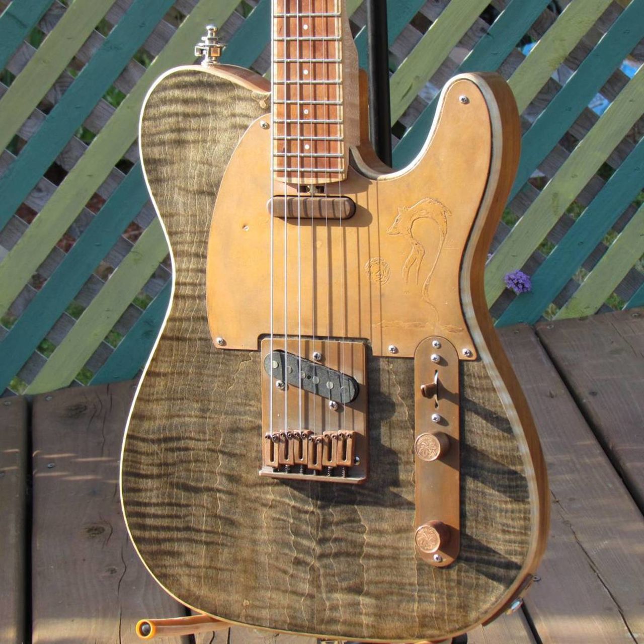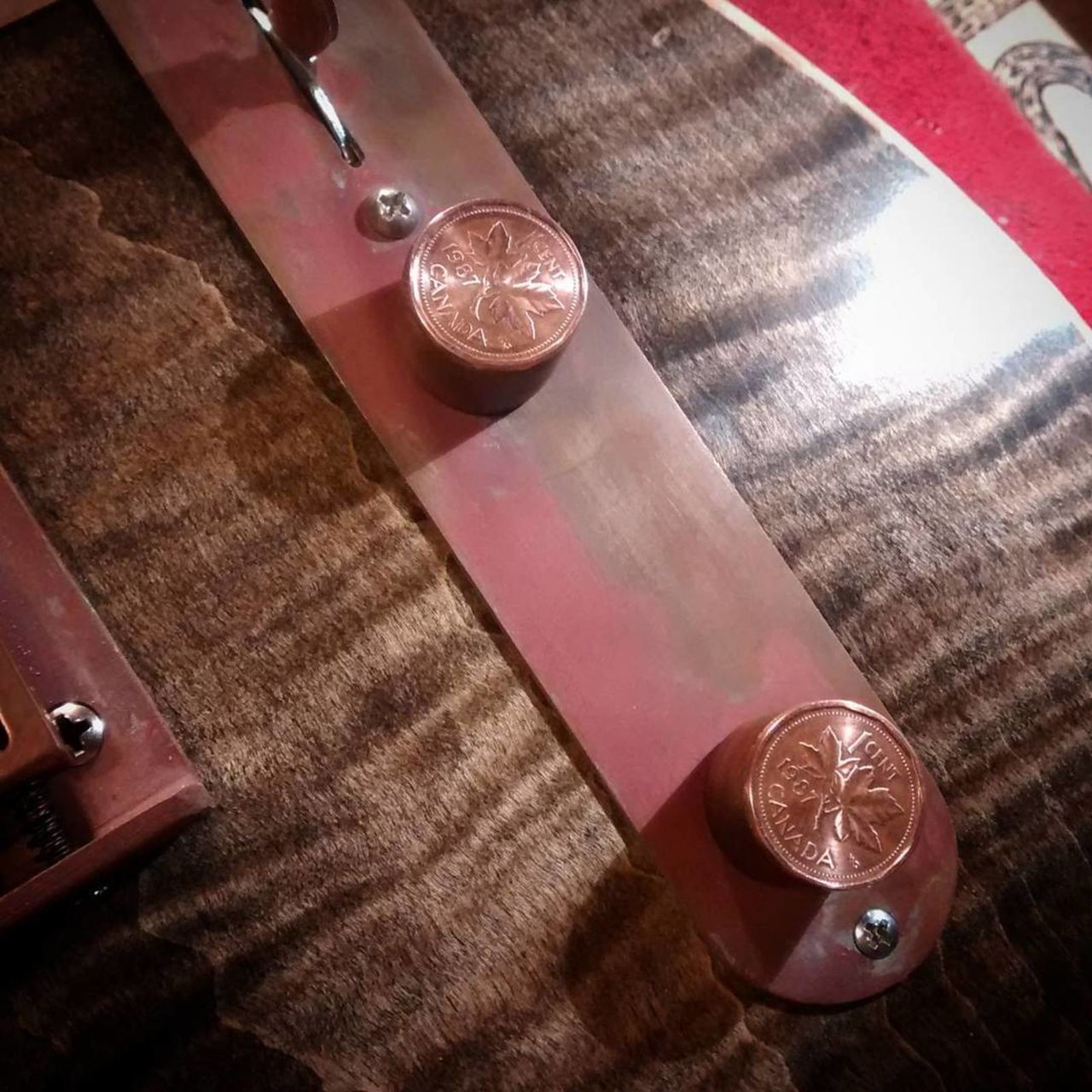 Le cuivre est Canadien aussi (!), et c'est le luthier qui a fait les decorations, les saddles etc... Il est artiste métallurgiste (je sais pas si ca se dit comme ça) à la base. Pas de plastique utilisé du tout, le dessus des potards c'est en fait des pieces de 1 centime canadiennes (qui ne sont plus utilisées depuis 2013) de mon année de naissance (1987).
