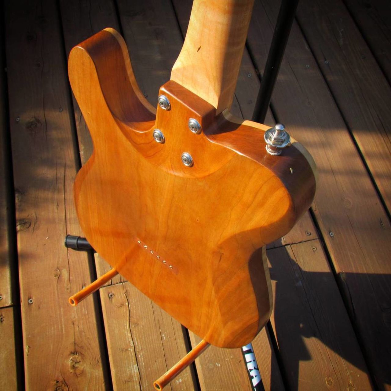 Les bois sont ultra locaux (j'habite dans l'Est de l'Ontario), l'érable qui a servi au manche et à la table est un érable à sucre du coin, la touche et l'arrière du corps sont en Black Cherry (une piece). L'acajou qui a servi aux boutons de potentiomètres est aussi local (Prince Edward County, une grosse region productrice de vin).