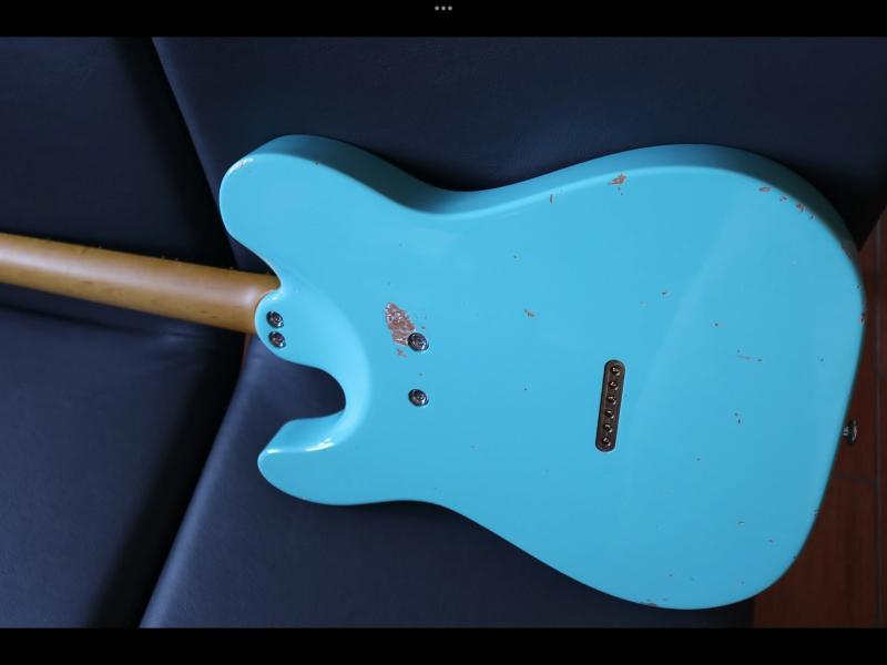 vernis nitro relic (les petits relicages sont assez bien fait, mais l’usure des bords un peu grossier et exagéré à mon goût). J’aime bien le relic en général, ça me permet d’être moins « manique » qu’avec des non relic, mais j’ai aussi des guitares non relic :