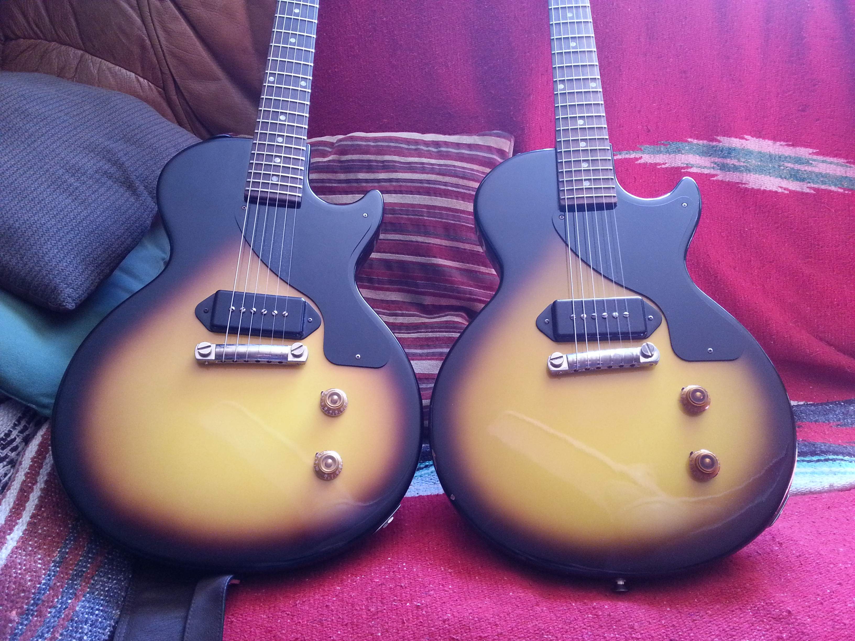 Je rejoins le club avec une Gibson Junior Custom Shop Historic 57 (gaucher) de 2002, en finition "acajou" (je n'ai pas le nom exact de la couleur), 100% d'origine. C'est (au moins) une 4e main, elle a donc déjà été jouée, mais l'état général demeure excellent (cosmétique et fonctionnel).