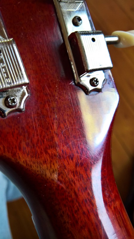 Elle a son lot de gnons, éraflures et traces d'usure tout à fait normales pour une gratte de 58 ans qui a été jouée - le plus "grave" étant une petite fêlure partielle de la tête quasi indistinguable tellement elle a été bien réparée (il a fallu que je cherche longtemps le bon angle pour la rendre visible):