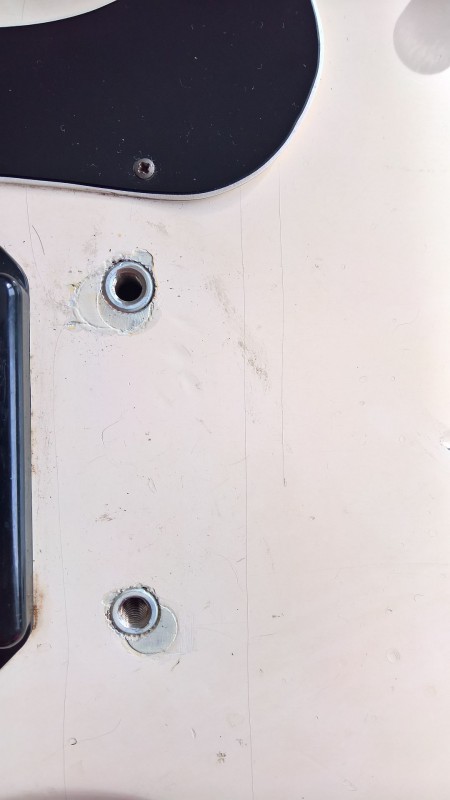 malheureusement, celà a été fait de manière "moderne", avec des inserts en métal insérés dans la caisse, sur lesquels viennent se visser les inserts du bridge; c'est évidemment plus solide que la façon "vintage-correct" qui consiste à visser directement les inserts du bridge dans le bois, mais question tone, beaucoup pensent qu'on y perd (ou au moins que ça change le son) (erreur de ma part, heureusement corrigée dans les réactions qui suivent