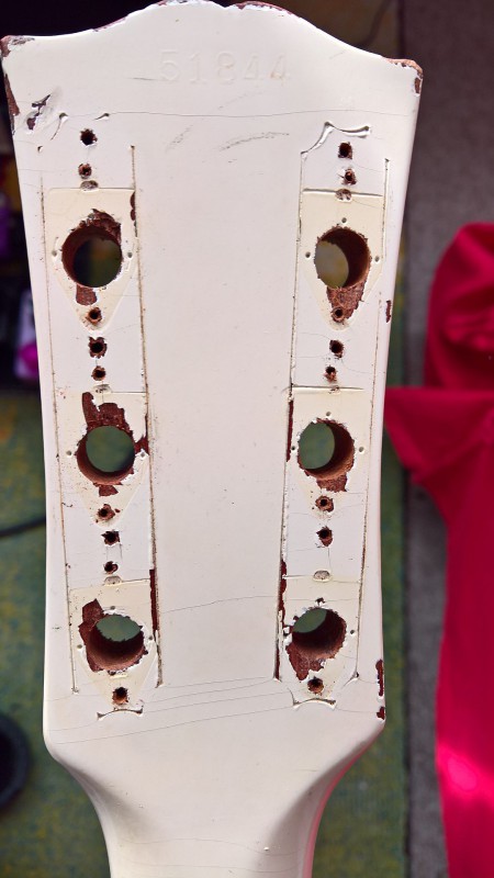 Pour rappel, ce bridge chromé à intonation moulée (heureusement 3+3) a été installé à la place du bridge d'origine "slant" (incliné, sans moulure d'intonation), et pour ce faire, les anciens inserts ont été bouchés, et de nouveaux inserts creusés -