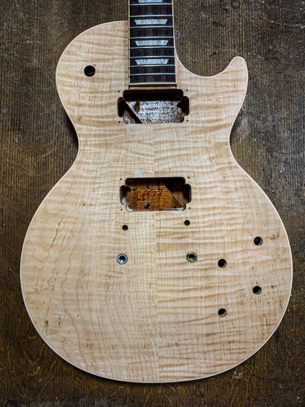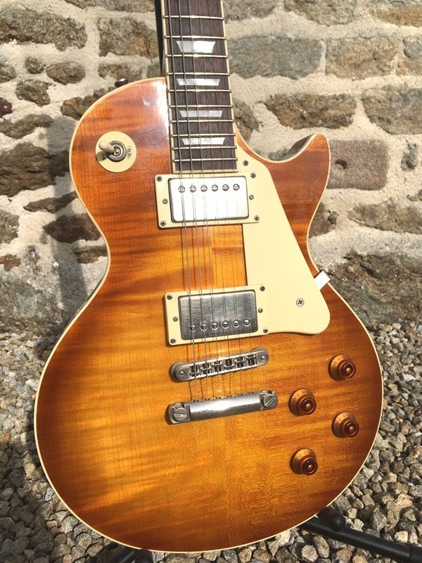 Michael de R'A, ma dit "viens voir j'ai peut être un truc pour toi". On est allé dans son atelier et il m'a présenté 2 Les Paul intégralement décapée, une avec des larges flammes et l'autre avec des flammes plus fines (en l'occurrence la 355 et la 354).