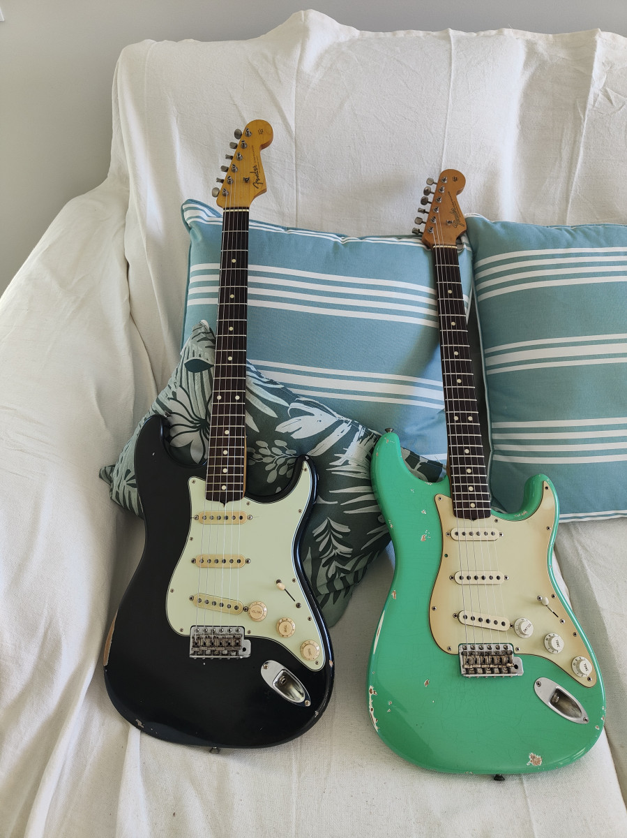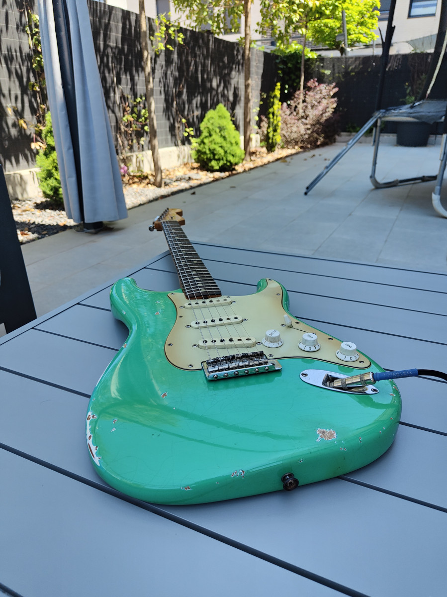Yes, elle a déja un vieux refin en un espece de Sea foam green bien vif qui lui donne un aspet unique je dois avouer donc pas évident de se décider... le pickguard fait trop cheap je trouve, il y a bcp mieux sur le marché genre les Carles Guitars en Angleterre.