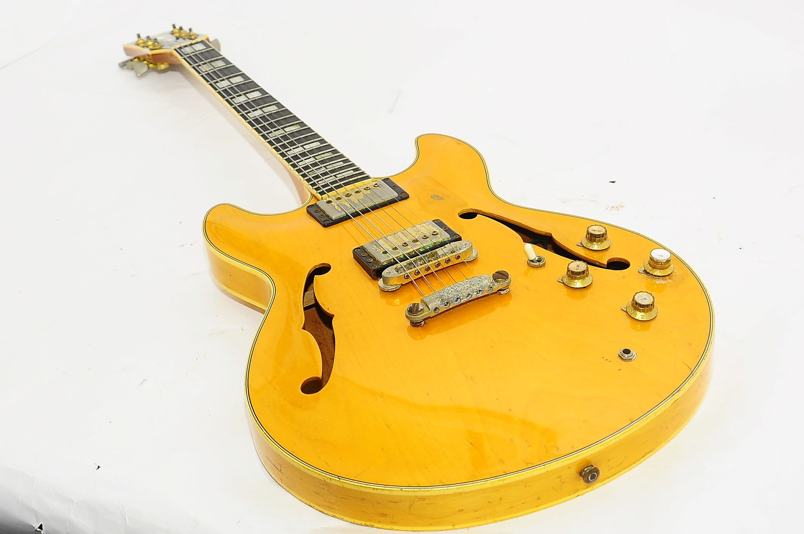 A budget contenu tu pourras te trouver une petite archtop chinoise full hollow genre ibanez AGB75 autour de 350€ d'occas ou alors une Epiphone Century avec un P90.