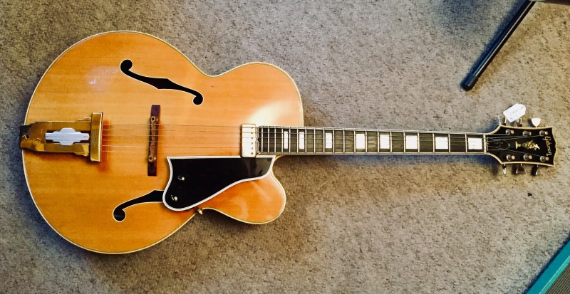 C’est bien une archtop Gibson de 1953 (j’ai une L-7C de 1952), vraisemblablement une L-4C, surtout que le vendeur précise table massive et fond laminé, ce qui, avec le cutaway pointu, distingue la L-4 de la L-5, de la L-7 de la L-10 ou de la L-12 (entièrement massives).