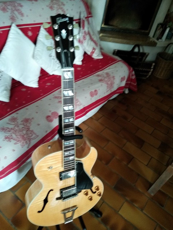 - détails de conception étranges. Comme le fait que l'oreille supérieure soit bombée, mais pas l'oreille inférieure, ce qui fait que le micro manche (qui est pile sur la jonction entre les deux) est penché naturellement. Les graves s'en trouvent suramplifiés si on ne compense pas. J'ai dû mettre le micro de travers (en jouant sur les deux vis de réglage) pour qu'il soit parallèle aux cordes et qu'il y ait un bon équilibre graves/aigus. J'ai fouillé des photos sur le net, a priori toutes les es175 modernes sont comme ça. Je l'avais déjà remarqué sur celle d'un copain.
