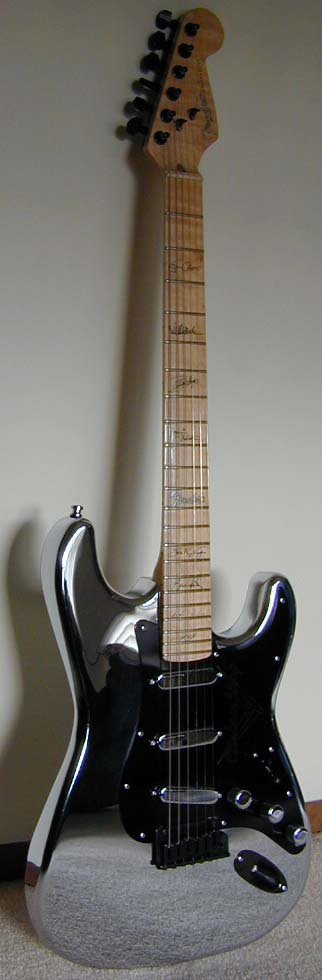 Eric Clapton 3rd fret, Jeff Beck 5th fret, Buddy Guy 7th fret, Yngwie Malmsteen 9th fret, Silver Fender logo 12th fret, Stevie Ray Vaughan 15th fret, Bonnie Raitt 17th fret, Richie Sambora 19th fret and James Burton 21st fret.