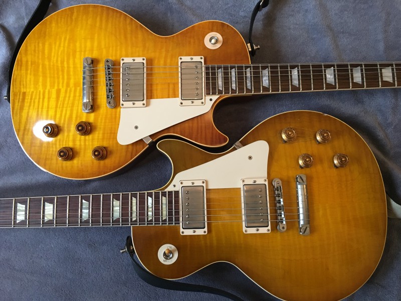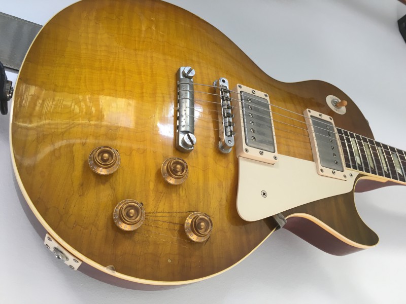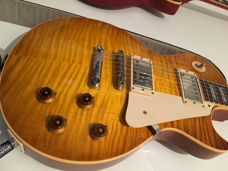 Présentation : 3,87kg, modèle unique sur demande spéciale du magasin, base spec 2013-2014, hide glue (manche-corps et manche-fretboard), long tenon,Truss-Rod-Kondom, custom buckers, acajou leger (table et manche pour le poids plume), touche dark palissander, Kluson et enfin couleur différente des classiques courants sur un top en érable flamé. Les vrais spec d'une vraie 59 quoi...