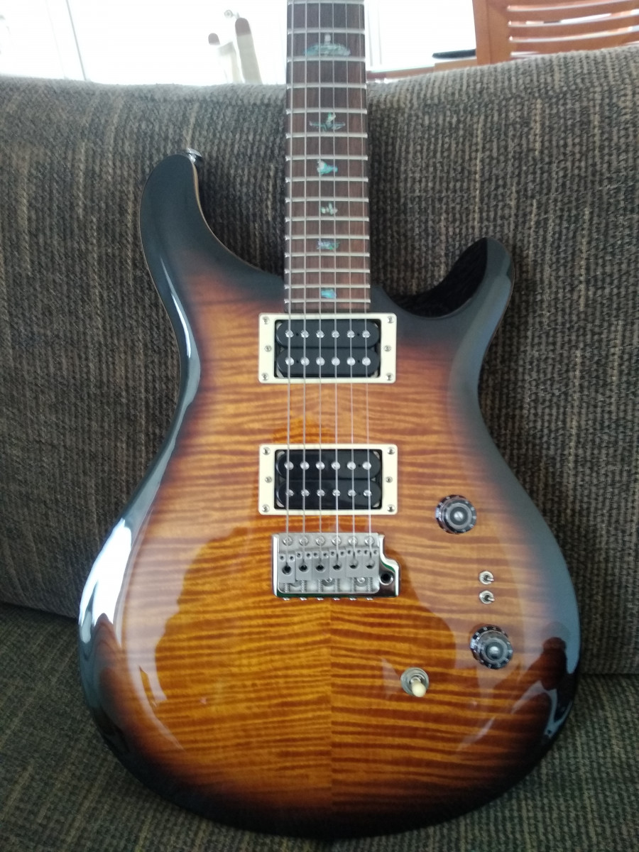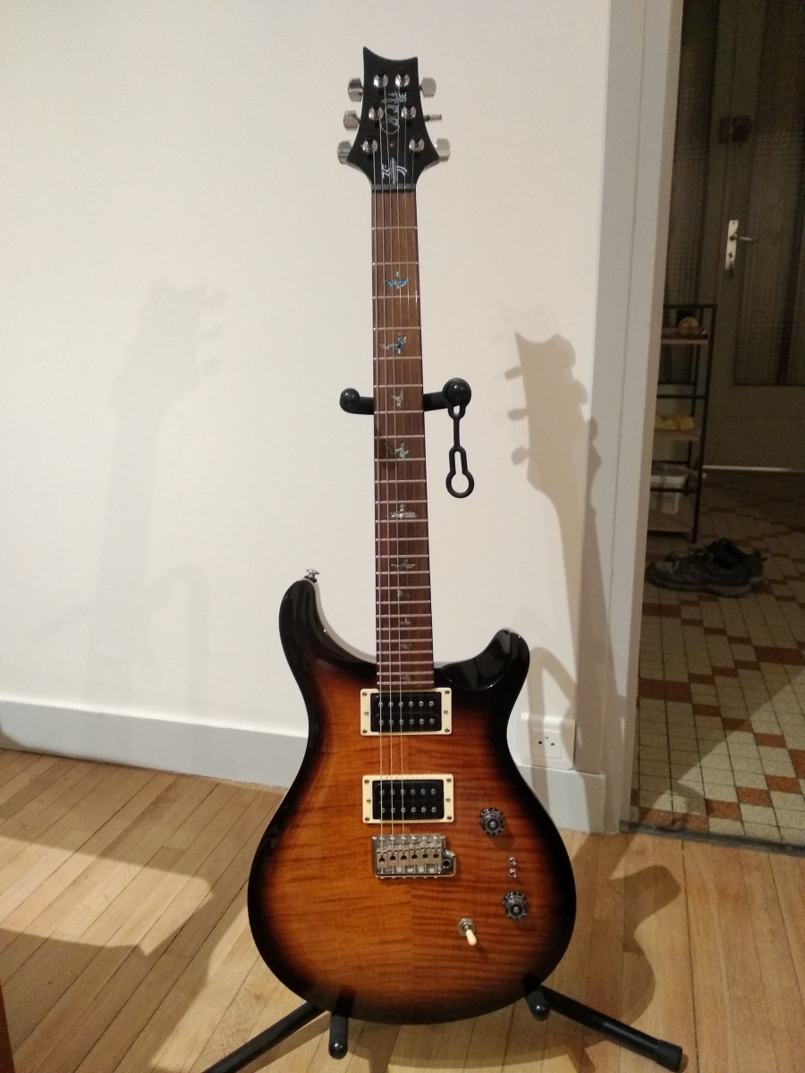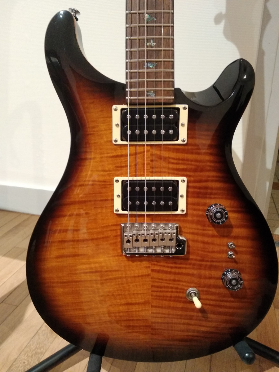 On me propose en échange d'une guitare aux specs Gibson une PRS SE Standard avec vibrato, en finition tabaco. Elle est très jolie a part le binding que je n'aime pas trop et des micros zebra....