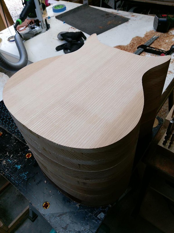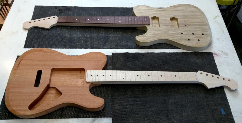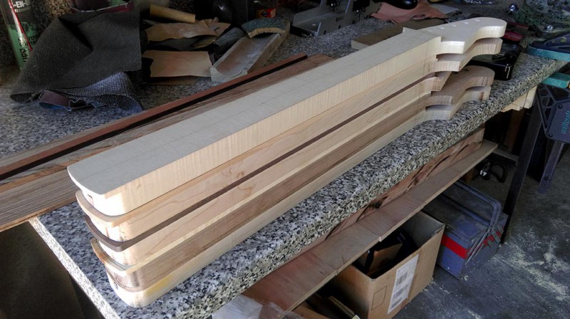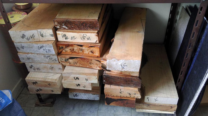Le stock de départ pour les premières pré-série de guitares et basses (aulne et frêne avant rabotage)