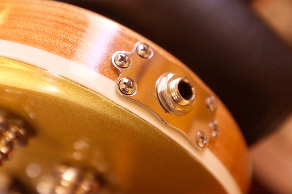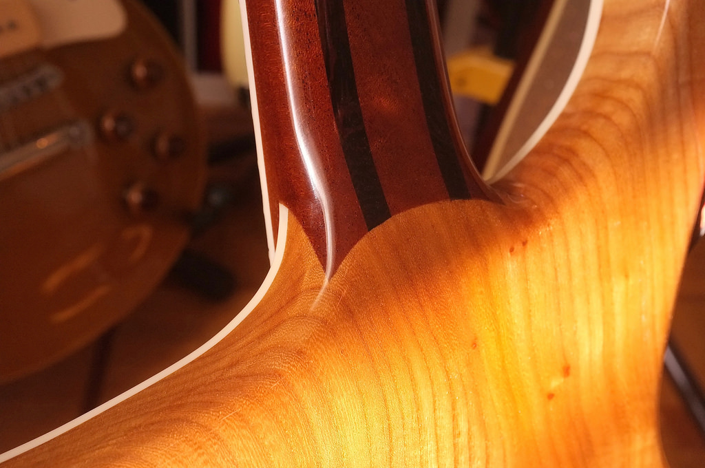 juste une photo qui montre toute la qualité de la construction: manche acajou wengé, long tenon qui s'insère dans un corps en orme bicentenaire...