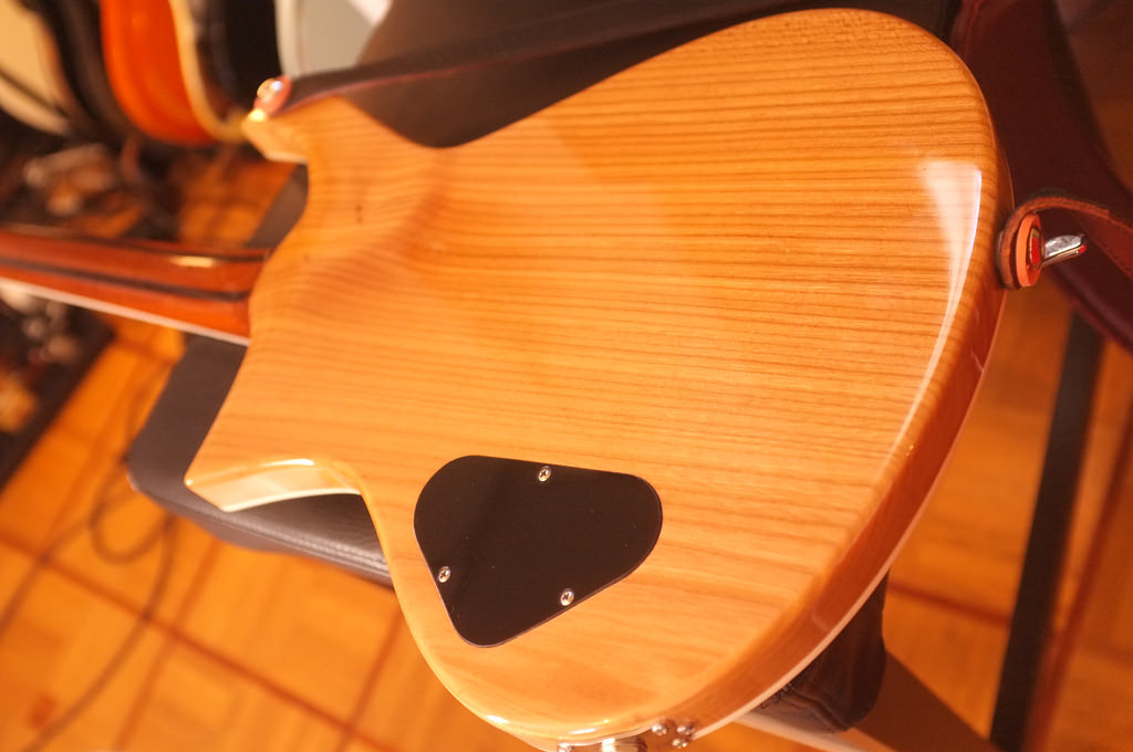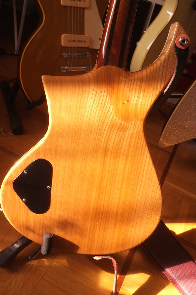 Je pense que l'usage de l'orme est assez inhabituel chez nous en lutherie, tout bêtement parce qu'il n'y en a plus beaucoup... Ce que je peux en dire: c'est beau, c'est pas lourd (la guitare est "fine"), et ça sonne.