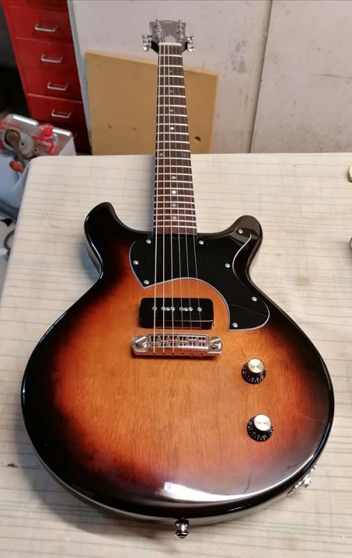 sur la style junior , une petite plaisanterie maison... qui bien que la guitare n'ait qu'un micro a deux sonorités particulières, une D90 et une autre plutôt mosrite... et tout mix possible entre les deux, le tout avec juste 2 boutons, un mix et un volume