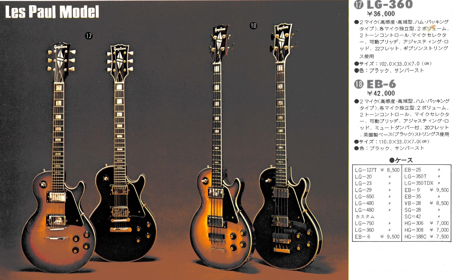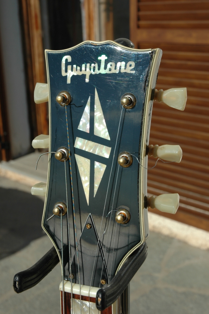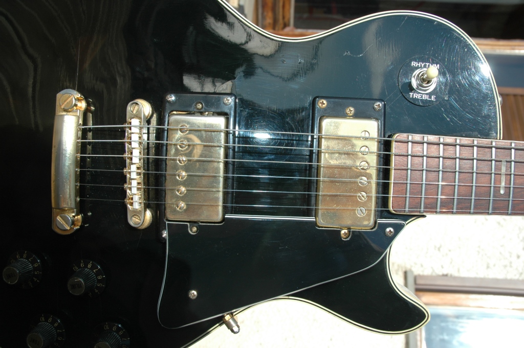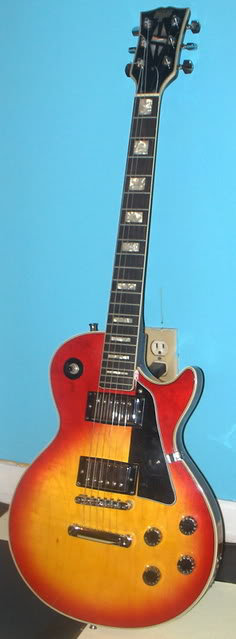Enfin bref, c'est une Guyatone LG-360 très certainement fabriquée en 1974 (d'après les n° de micro). Alors Guyatone, c'est pas rien : c'est une des plus anciennes manufactures japonaises d'instruments de musique et de matos, amplis, sonos, effets etc. Ils ont cessé de fabriquer des grattes au début des années 80. Les brochures commerciales que j'ai pu trouver me disent qu'en 1974 cette Les Paul valait 36.000 yens, mais j'ignore à quoi ça équivaut. Ceci dit, c'est du cheap-cheap : manche vissé typique des copies jap début 70's, corps en CP avec un placage bombé en guise de table et du creux en dessous (conception courante à l'époque dans le bas de gamme) ! Pour le sustain de la mort qui tue on repassera mais elle a quand même sa petite gueule. Allez, action :
