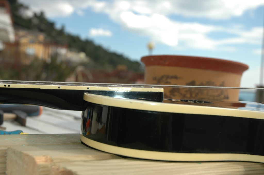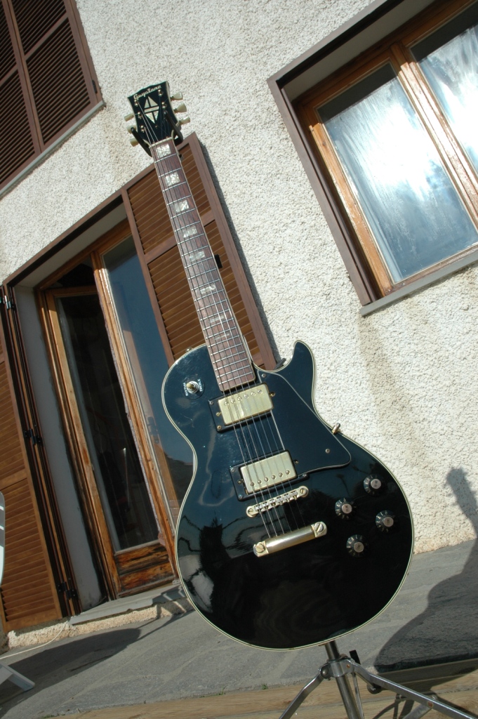 vieilles pelles bridées à deux balles, je créé le mien. C'est juste histoire de présenter ma dernière râpe et de causer autour de ça si toutefois ça intéresse du monde. C'est une vieille (40 ans) copie nippone de Les Paul que j'ai dégotée il y a quelques jours derrière les fagots. Ahhhhh.... j'entends déjà Tokaï Greco Orville Burny et tout et tout, meuh non, moi je fais dans le popu moi m'sieur, dans l'bas d'gamme, j'ai pô les moyens ! Pour tout dire, je l'ai payée quelques dizaines d'euros, voilà, maintenant que c'est dit, on ne cause plus de fric.