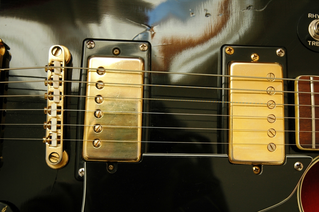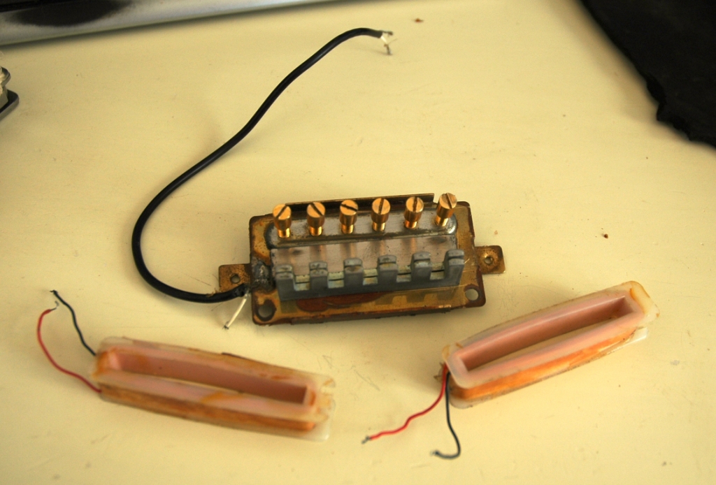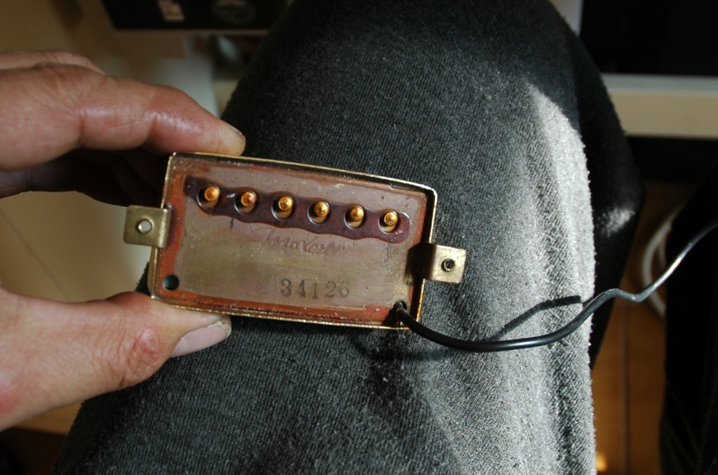 Ha ha on va pouvoir shredder à mort et bourriner à la Gary Moore, je l'sens. Bon on s'occupe des trucs qui envoient les watts. Les micros sont des Maxon, apparemment les mêmes qui étaient montés à cette époque sur une grande partie de la production japonaise aka Grekaï Toco et consorts. Ils portent le n° 34126 et j'apprends que ça veut dire 26 janvier 1974. Par contre, le bridge ne fonctionne pas ... Pourtant il est encore magnétisé ... investigation en cours. Je monte un Mighty Mite récupéré sur une Cort que j'ai en stock. Tiens, pas tout à fait les mêmes dimensions, les Maxon sont plus gros.