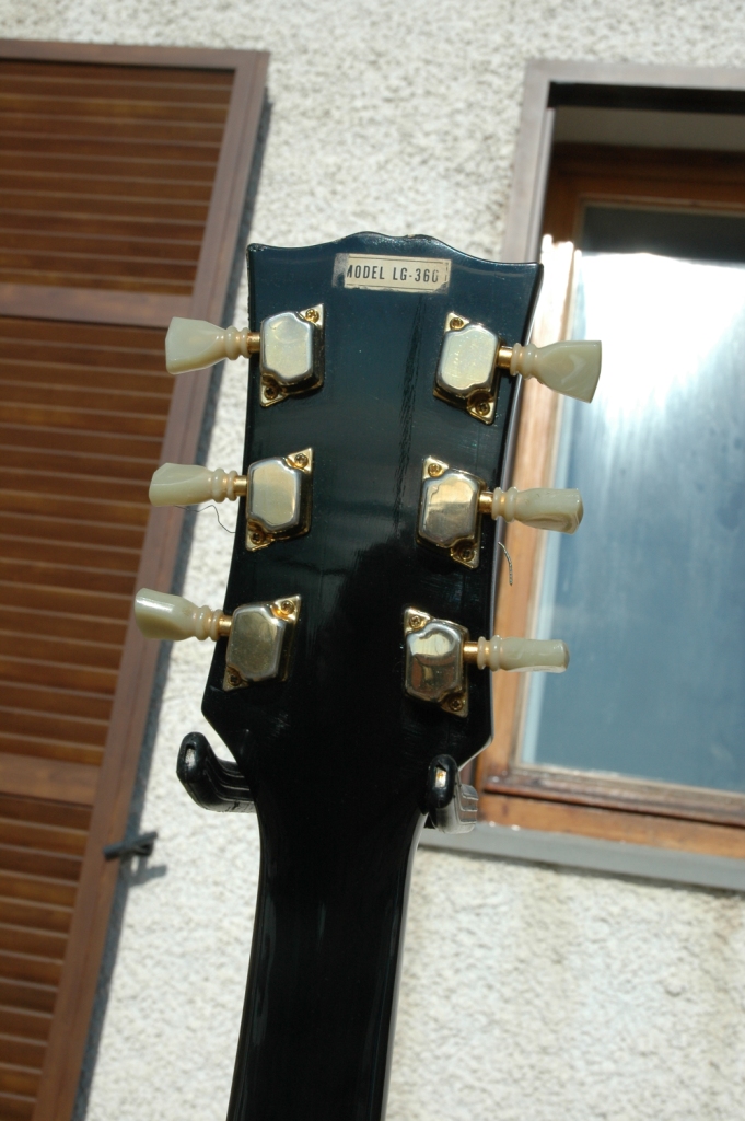 Plusieurs remarques. Grande inquiétude au sujet du manche, pensez donc, 40 ans, une guitare bas de gamme. Or, droit comme un I. De plus, truss-rod 100% fonctionnel et à peine en tension. Franchement, chapeau, les grattes bas de gamme actuelles pourront-elles dire la même chose dans 40 ans ? Ce qui fait chier c'est que je serai mort et je ne pourrai pas le vérifier, mais bon, c'est comme ça. Frettes nickel, mais a t-elle été vraiment jouée ? Mécaniques vintage pas à bain d'huile mais tout à fait acceptables, assez précises et elles tiennent l'accord. Au dos de la tête il y a même l'autocollant d'origine indiquant de quel modèle il s'agit. On voit aussi qu'il y a une vilaine réparation sur le coté.