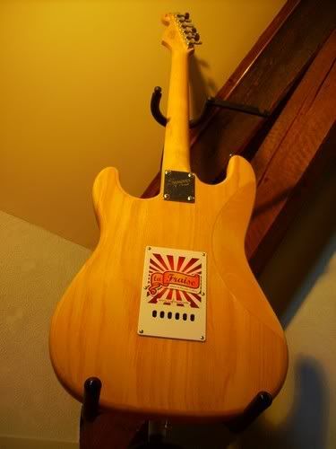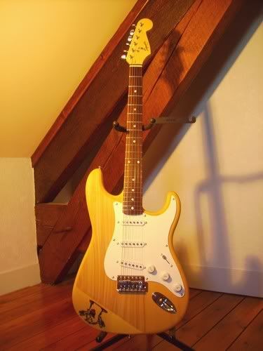 Un bel aspect relic comme certain aiment, des griffes, des coups blancs dans la peinture rouge, un pickguard qui a vieilli, des frettes en dent de scie, plus de cache micro (je ne sais pas pourquoi je l'ai enlevé d'ailleurs...), des marques sur le manche, etc...