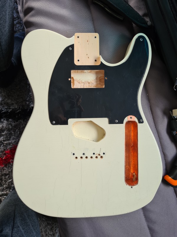 Ou bien plus récemment le vernis de ma Teleman aged, soi-disant du nitro dans les specs, mais en fait c'est un bon gros polyurétane bien épais (ma guitare est en refinish chez un luthier parce que la finition devenait hideuse après seulement 2 ans...).