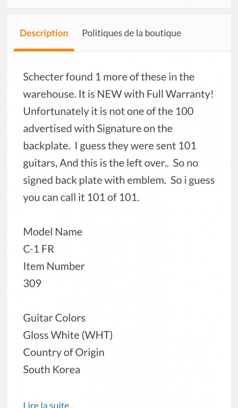 La description mentionnait un modèle neuf, qui soit disant était un modèle en plus, sorti des ateliers de corée et qui du coup, n'était pas signé par le guitariste. Une sorte de "101 sur 100".