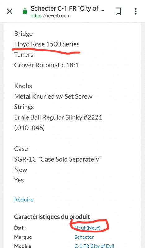 Je passe commande, elle arrive, et lors du déballage, d'entrée la guitare me paraissait louche. Touche dégueulasse, frettes planes sur le sommet, micros abîmés, binding jauni, poids plume alors que le corps est en acajou et surtout le floyd rose monté ne correspondait pas au modèle renseigné dans l'annonce (un 1000 au lieu d'un 1500, modèle exclusif pour Schecter) et qui était pour moi l'un des points clés de cette guitare  !