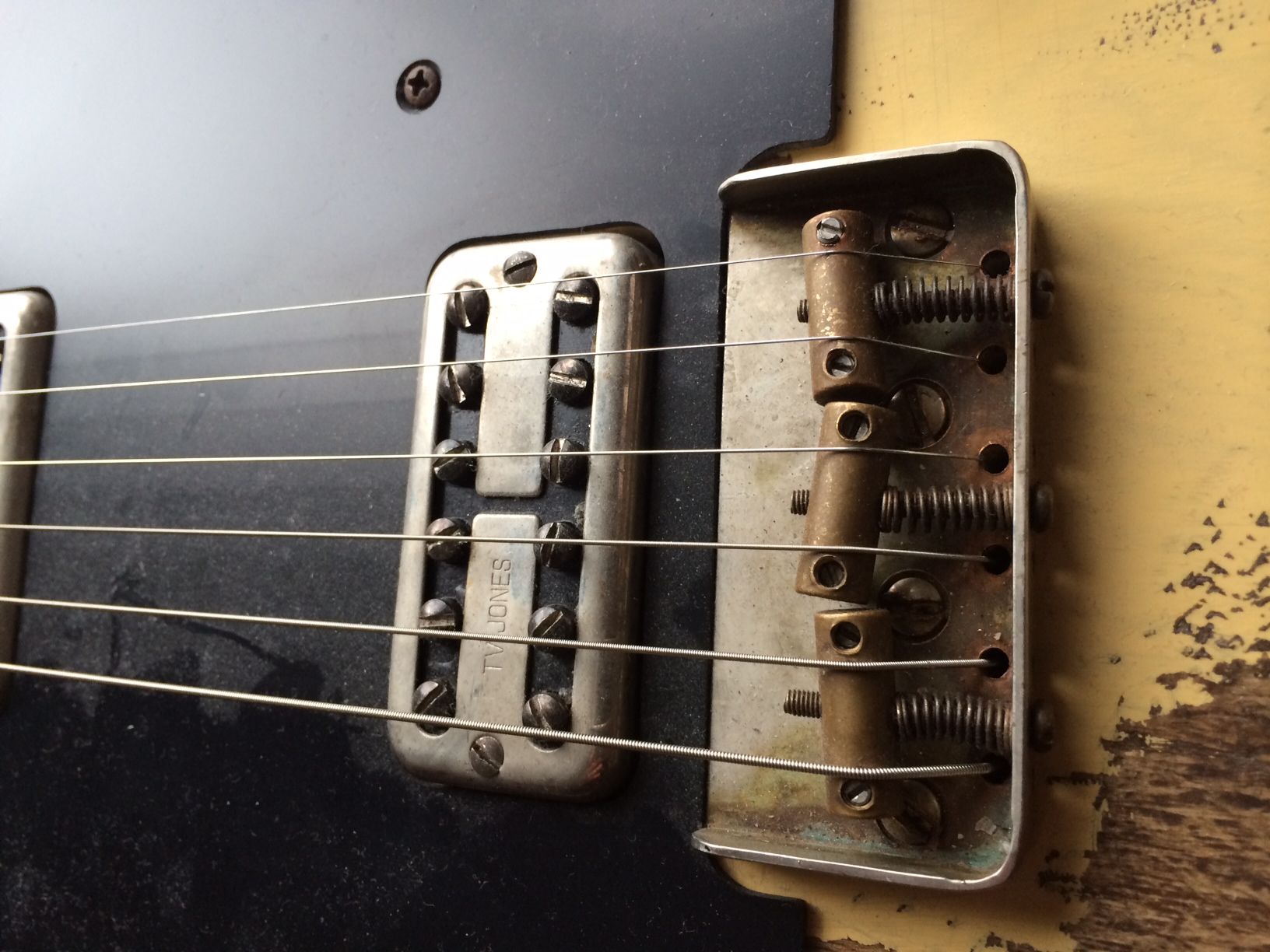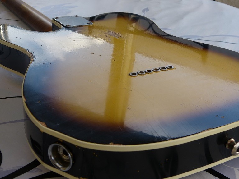 il va falloir recouper le pickguard tout droit au niveau de la deuxieme rangee de plots du micro bridge ! vu le faible niveau de sortie des powertrons , ca donne quoi en split ?