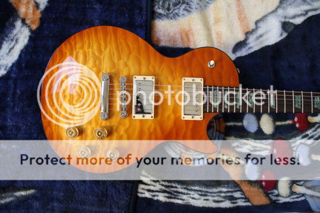 Bonsoir tout le monde, j'ouvre vite un tout petit topic à la con, qui ne concerne même pas ma guitare, mais ça m'a intrigué. J'ai un pote qui s'est ramené aujourd'hui avec une Epiphone Les Paul, repeinte en bleu pailleté (sympathique comme tout, mais ça manque de burst), avec un binding sur le manche, nom et repères en abalone, repères trapézoïdaux d'ailleurs, mais pas de caches micros (micros à vif). La tête ne comporte que l'inscription "Les Paul Model", et la plaquette de protection du truss-rod "Gibson". Par simple curiosité, j'aurais voulu savoir s'il était possible de trouver quel modèle c'était avant la modification (boutons, plaque enlevée, peinture, et peut-être d'autres) grâce au numéro de série?