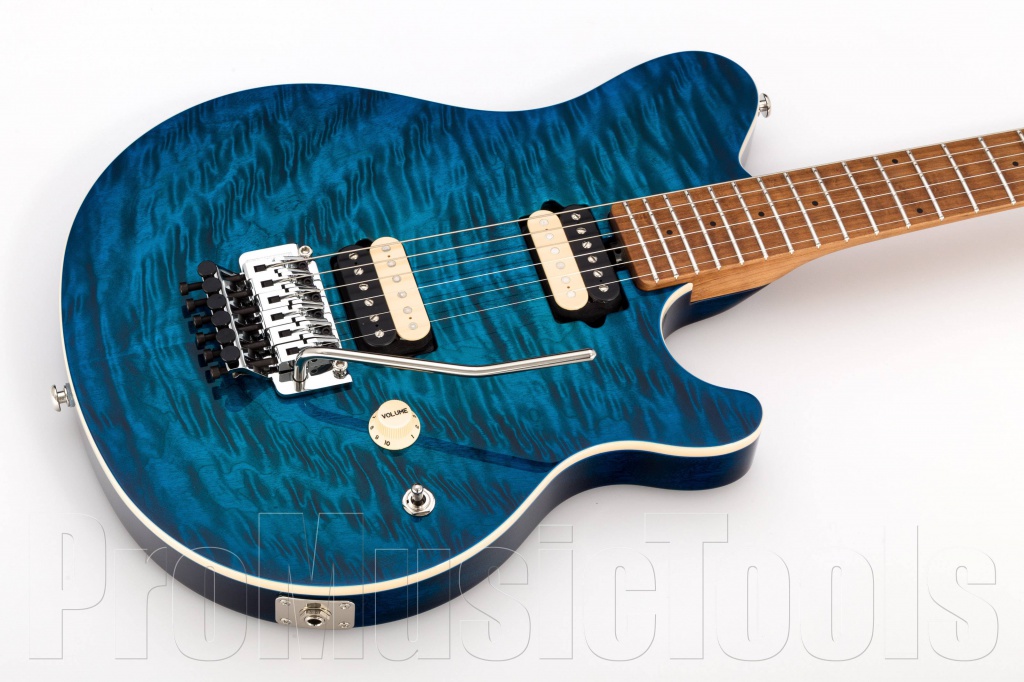 Les features spécifiques sont les suivantes : corps acajou au lieu du traditionnel tilleul, une belle table en érable pommelée finition "Neptune Blue", un manche "roasted" en érable et des frettes inoxydables.