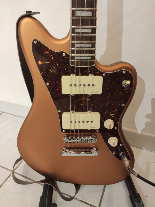 J'avoue avoir craqué sur la Jazzmaster (JA-25TH Firemist). Les vidéos semblaient convaincantes niveau son, le look Jazzmaster (un peu plus petite qu'une vraie), la couleur et sur le papier ça semble bien fini, soigné, même monté avec de vraies bonnes cordes (Elixir, pas ma marque préférée mais c'est plutôt bien), manche torréfié en érable flammé canadien, corps en aulne américain, sillet graphite, frettes medium jumbo inox... clairement ils n'ont jamais fait mieux pour une Jazzmaster Harley Benton. Et puis je n'ai plus de Jazzmaster, donc, pour le prix, pourquoi pas.