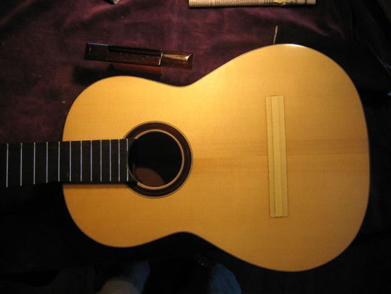 4 filets tres fins bordent la table d'harmonie, ainsi que 3 filets qui parcourent la caisse et le dos de la caisse. On peux aussi voir les mailles assez larges du red cedar.