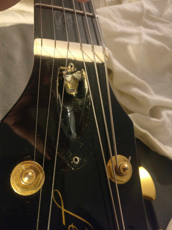 1 - la finition : je m'attendais au classique blanc qui a viré à la crème, ici c'est plutot jaune d'oeuf mélangé avec du thé vert. Mon précédent luthier m'a confié ne jamais avoir vu ça et que la peinture a surement été refaite. Vous en pensez quoi ? sachant qu'à l'époque il y avait uniquement le rouge bordeaux et les blanches qui étaient équipées de touche en ébène ça me parait un peu bizarre. Je me dis que c'est peut-être un autre blanc utilisé à ce moment là qui a veilli autrement ?