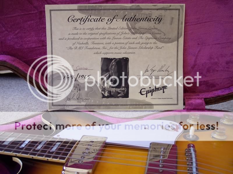 Pour répondre à ta question Neozecat, j'ai eu la Lennon neuve sur la bay US mais sans le case marron ni la photo de John. En fait, un gars à presque eu la même histoire que moi (dans le célèbre moteur de recherche goo..., tapez "guitar perso free" et "casino 1965"). Si vos lisez son histoire, lui n'a eu que la lutherie puis a racheté toutes les autres pièces en plus. Moi, elle était "complète" (micros gibs, potards, mécas....) mais sans case (juste un classique case Epi, beau d'ailleurs).