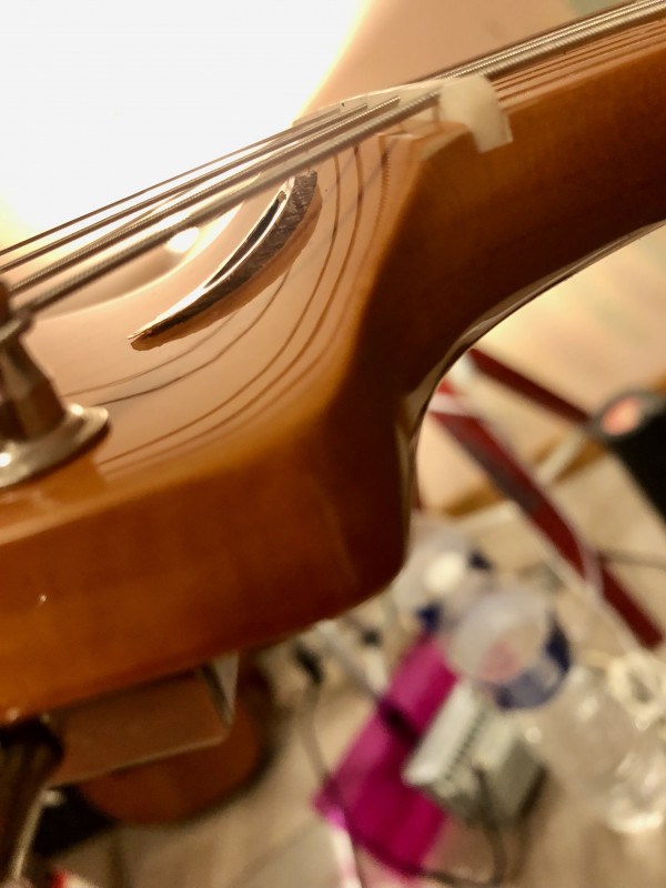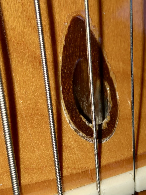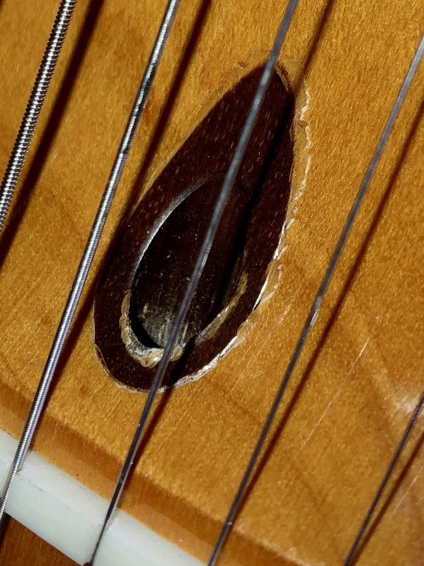 Tu n'as pas cassé le Truss Rod (enfin pour l'instant rien ne le laisse présager), ce qu'on voit c'est le bouchon du canal de TR qui s'est décollé et commence à sortir.